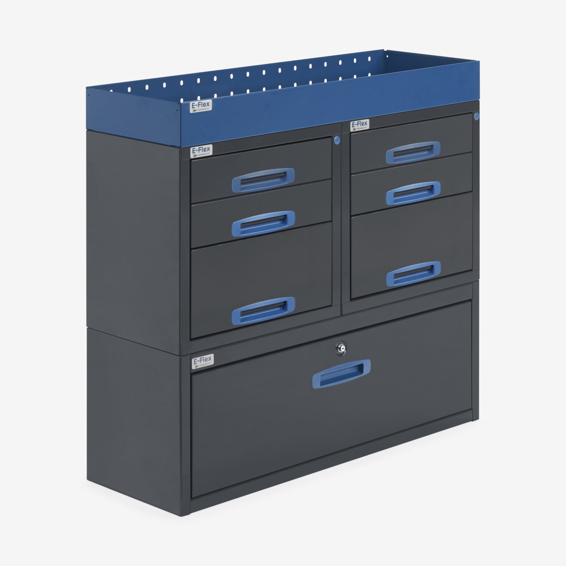 Durable E-Flex van racking units with drawers are popular and versatile storage solutions for vans. These units combine drawers, open shelves, and other storage spaces to maximize organization. The racking units are finished in powder-coated anthracite, complemented by a stylish powder-coated blue finish.