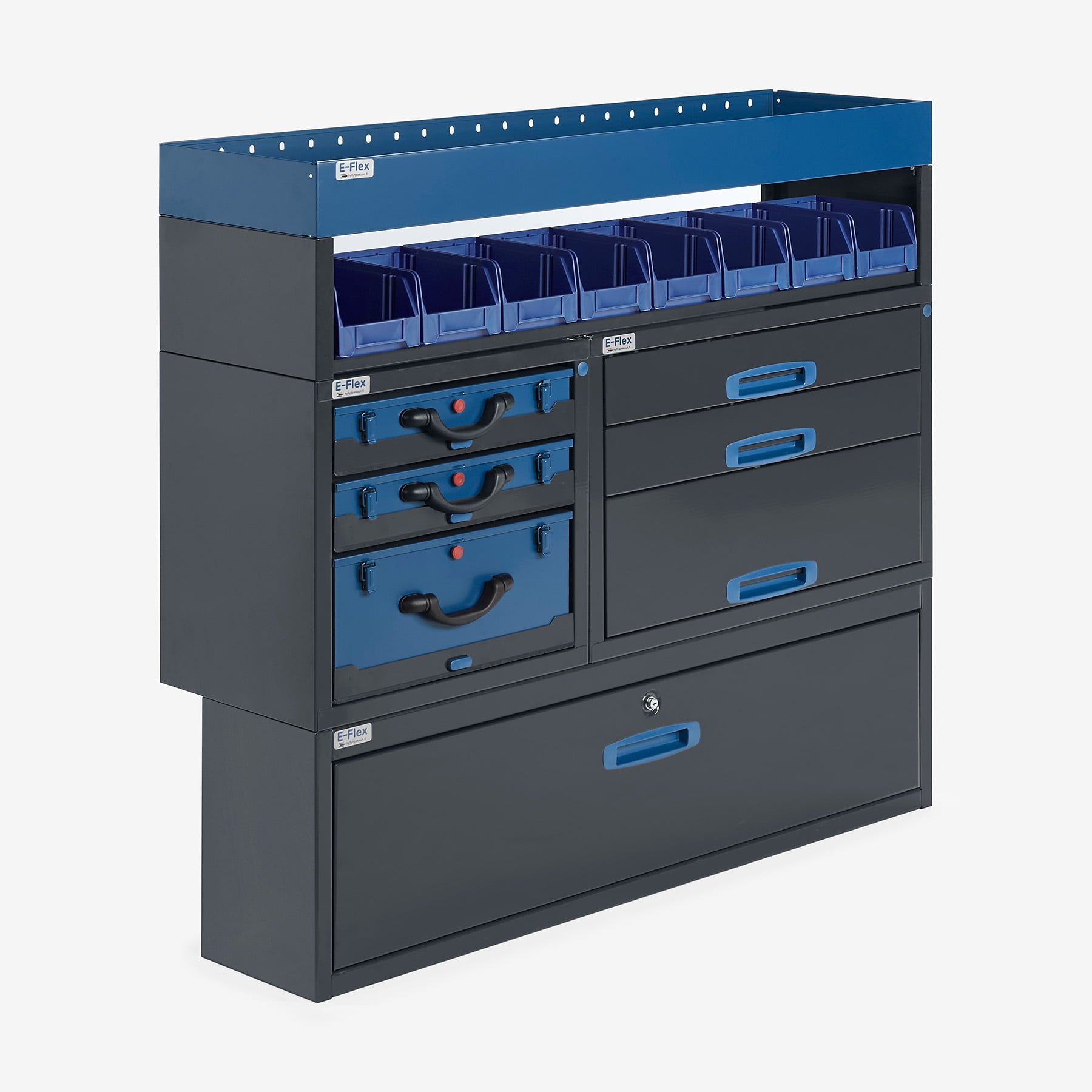 durable E-Flex van shelving units / drawer units are popular and versatile van fittings. The unit combines drawers, open shelves, and other storage spaces. The main colour of the units is powder-coated anthracite, with a stylish powder-coated blue as a secondary option. The modular design of the product sets makes assembly and installation easy and straightforward. The modular nature also allows for great flexibility in adjustments. The rails of the drawer units are ball-bearing guided (capacity 40 kg) and are specifically designed for vans, meaning the drawers lock in place both in the open and closed positions, preventing them from opening unintentionally during driving. We offer a 10-year warranty on these products, ensuring they will stand up to demanding professional use. Complete your setup with the necessary accessories.