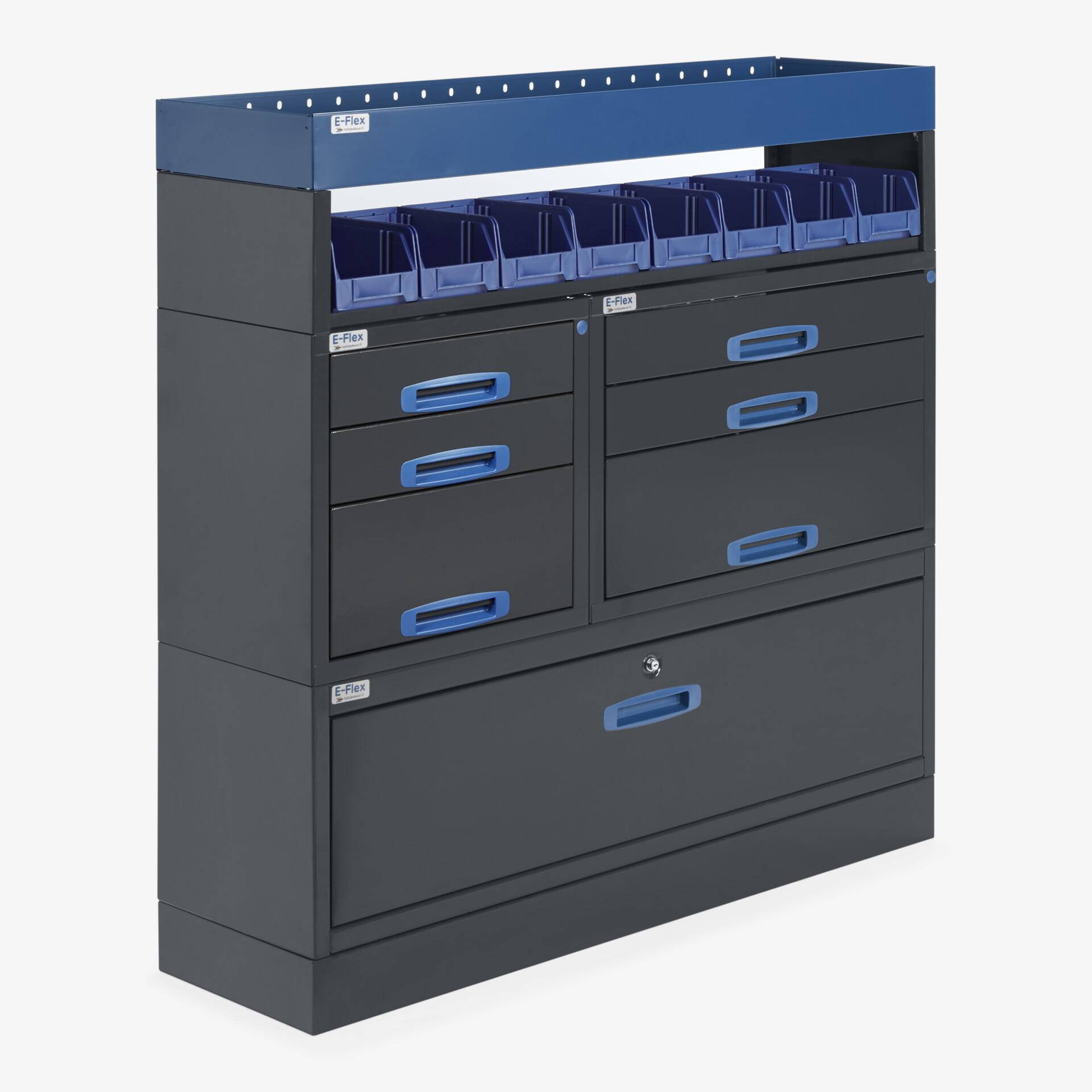 The E-Flex solid van shelving / drawer units are a popular and versatile van storage solutions solution. The furniture combines drawers, open shelves and other storage spaces. The main colour of the shelving/drawer units is powder-coated anthracite and the second colour is a stylish powder-coated blue. The modular products are easy and clear to assemble and install. They are also highly adaptable due to their modular design. The drawbar rails are ball bearing mounted (load capacity 40 kg) and made specifically for vans, i.e. the drawers lock in place in both open and closed positions and do not open by themselves when driving. We offer a 10-year warranty, which ensures that they will really stand up to even the most demanding professional use. Complete your furniture with the accessories.