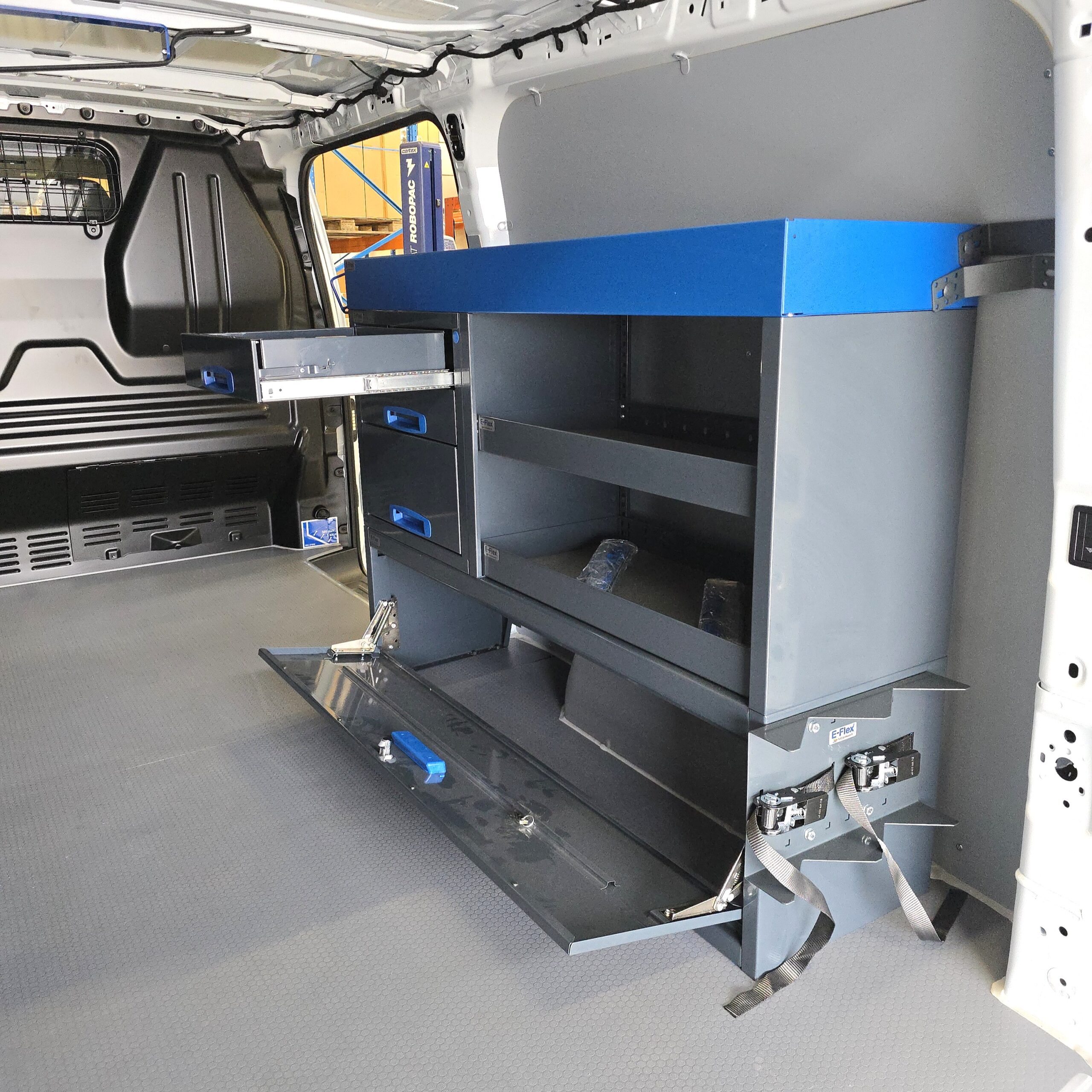 The durable E-Flex van racking units / drawer units are popular and versatile storage solutions for vans. The unit combines drawer units, open shelves, and other storage spaces. The main color of the units is powder-coated anthracite, with stylish powder-coated blue as a secondary color. The modular design makes it easy to assemble and install. Due to the modular structure, the units are also highly customizable. The drawer rails are ball-bearing equipped (load capacity 40 kg) and designed specifically for vans, meaning that the drawers lock securely in both open and closed positions, preventing them from opening during driving. We offer a 10-year warranty on the products, ensuring that they will withstand demanding professional use. Complete your setup with the necessary accessories