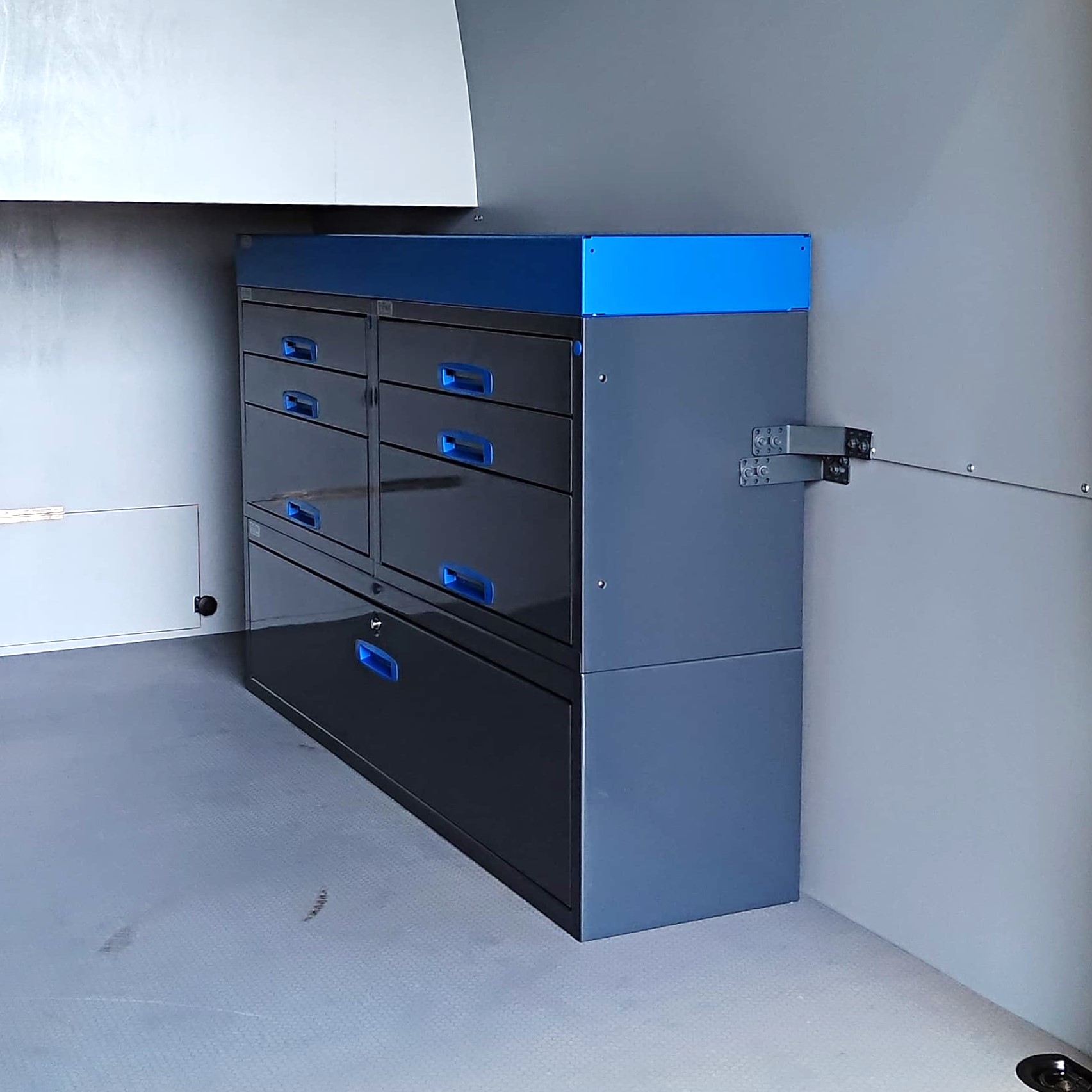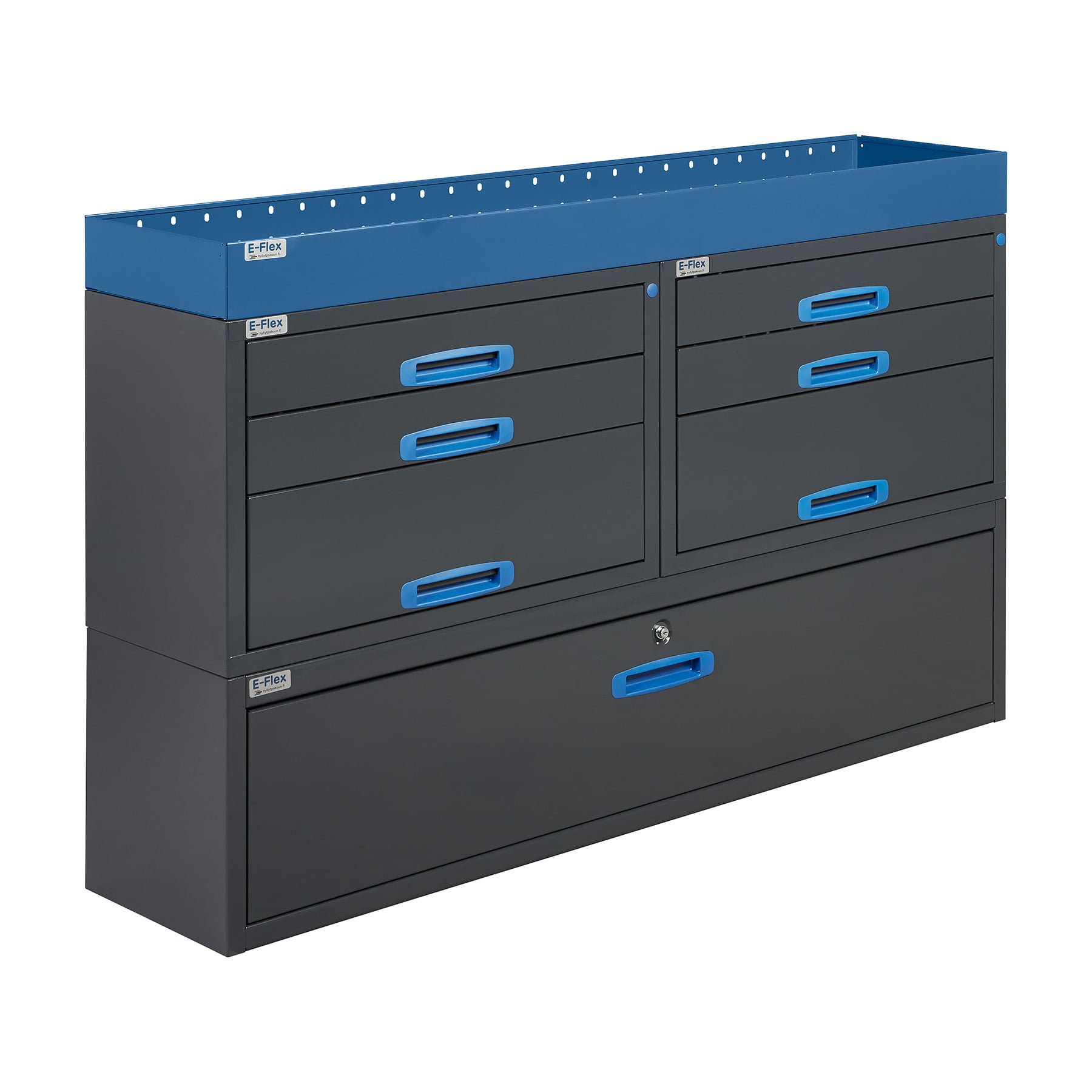 The durable E-Flex van racking units / drawer units are popular and versatile van storage solutions. The unit combines drawer units, open shelves, and other storage spaces. The main color of the units is powder-coated anthracite, with a stylish powder-coated blue as a secondary color. The modular design makes it easy to assemble and install. Due to their modular structure, the units are also highly customizable. The drawer rails are ball-bearing equipped (load capacity 40 kg) and designed specifically for vans, meaning the drawers lock securely in both open and closed positions, preventing them from opening during driving. We offer a 10-year warranty on the products, ensuring that they withstand demanding professional use. Complete your setup with the necessary accessories.
