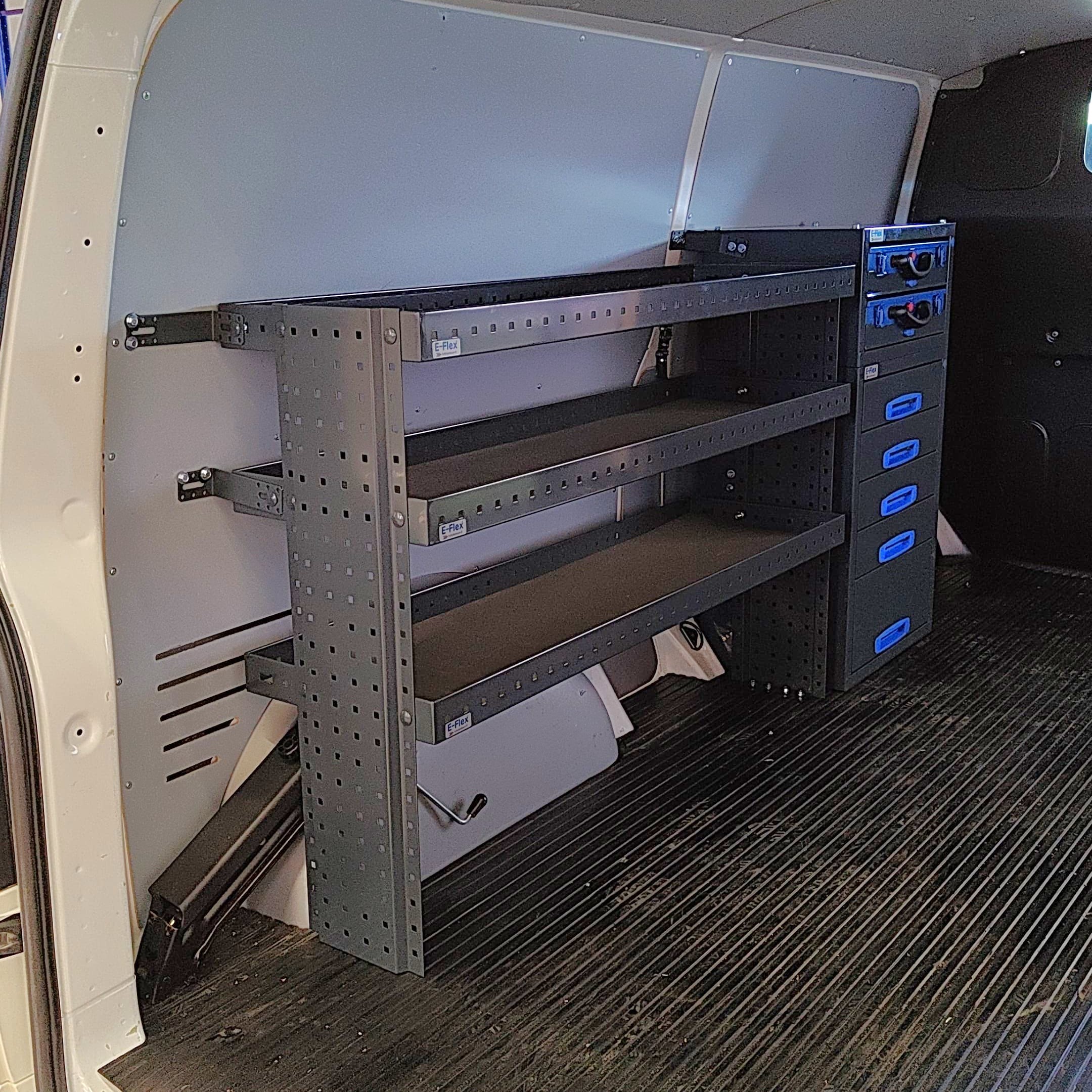 This racking unit is a practical combination of open shelving, a drawer unit, and a removable case, designed to keep your van’s cargo space organised.