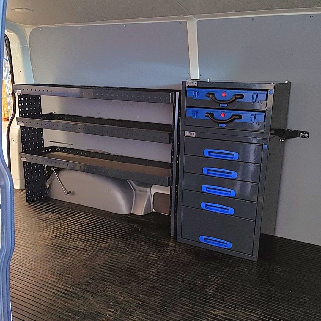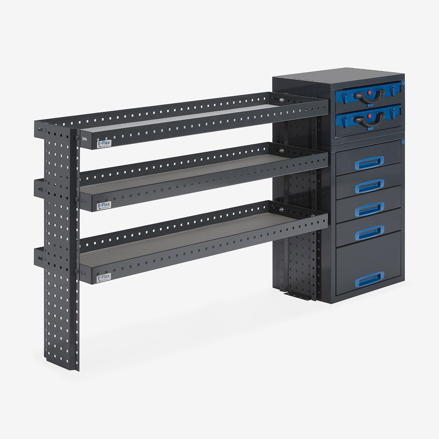 Durable E-Flex van racking units / drawer units are popular and versatile van storage solutions. The unit combines drawer units, open shelves, and other storage spaces. The main color of the racking / drawer units is powder-coated anthracite, with an additional stylish powder-coated blue option. The modular design makes assembly and installation easy and straightforward. Due to the modular structure, these product sets are also highly customizable. The sliding rails of the drawer units are ball-bearing (load capacity 40 kg) and specifically designed for use in vans, ensuring that the drawers stay securely in place whether open or closed, preventing them from opening during transit. We offer a 10-year warranty, ensuring that these products will withstand even the most demanding professional use. Complete your setup with the necessary accessories.