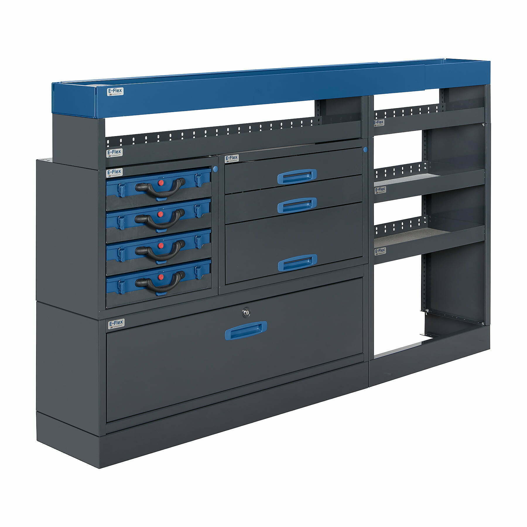 Durable E-Flex van racking units / drawer units are popular and versatile storage solutions for service vehicles. The unit combines drawer units, open shelves, and other storage spaces. The primary color of the units is powder-coated anthracite, with an additional color option of stylish powder-coated blue. The modular structure makes the system easy to assemble and install. Due to their modular nature, the units are also highly customizable. The ball-bearing rails for the drawer units (load capacity 40 kg) are specifically designed for vans, ensuring the drawers lock securely in both open and closed positions, preventing them from opening during transit. We provide a 10-year warranty for the products, ensuring their durability in even the most demanding professional environments. Complete your setup with the necessary accessories.