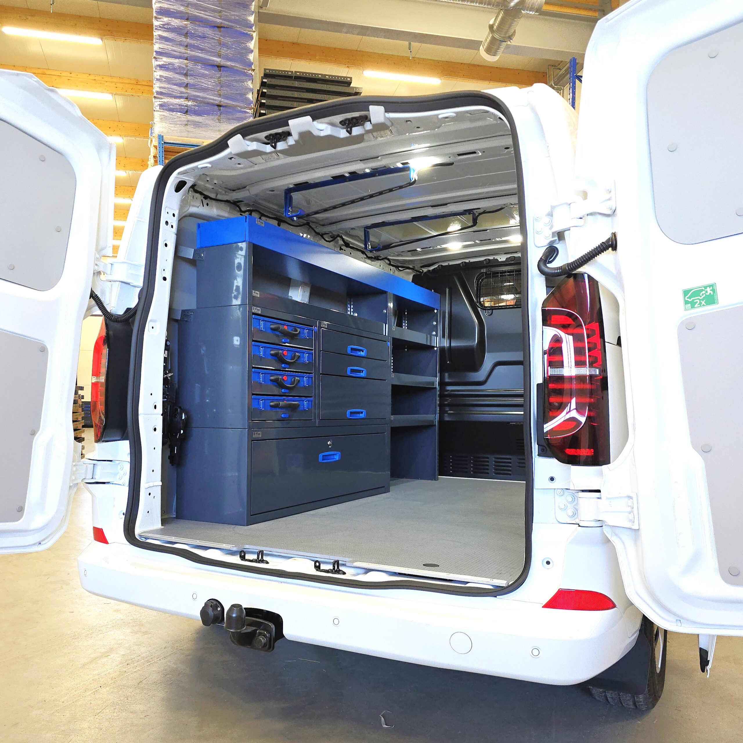 This racking system is designed for L1H1-sized vans and is particularly suitable for models such as Ford Transit Custom L1 Short, M-B Vito Medium, Nissan Primastar Short, Renault Trafic Short, and VW Transporter Short. The system combines drawer units, open shelves, and storage spaces, offering a versatile and customizable storage solution for professional use. The powder-coated anthracite and blue colors make it a stylish and durable option. The ball-bearing drawer units lock securely and do not open during transit. A 10-year warranty is provided, ensuring durability in even the most demanding conditions. Complete your setup with the necessary accessories.