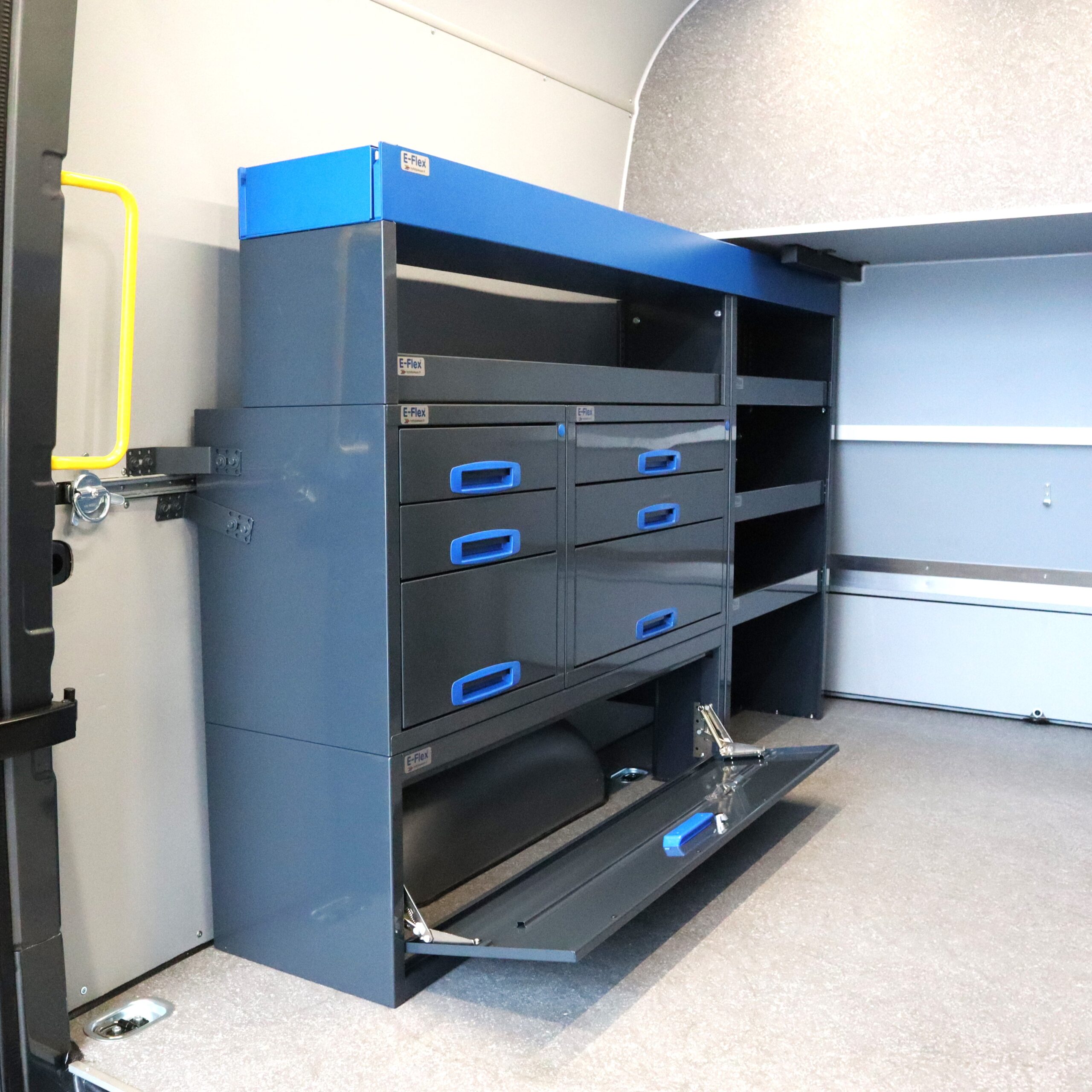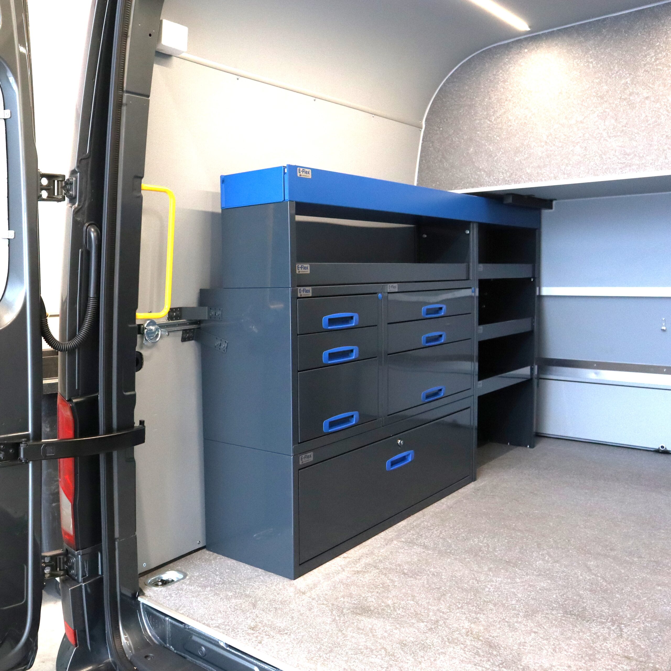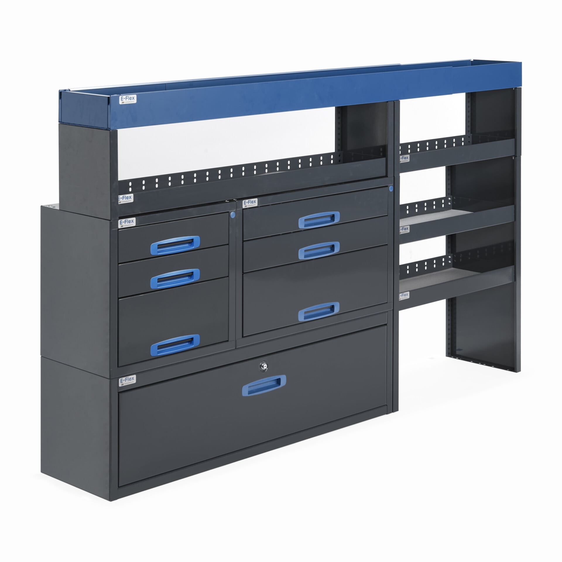 This racking system is designed for L1H1 class vans and is especially suitable for models like Ford Transit Custom L1 Short, M-B Vito Medium, Nissan Primastar Short, Renault Trafic Short and VW Transporter Short. The system combines drawer units, open shelves, and storage spaces, offering a versatile and customizable storage solution for professional use. The powder-coated anthracite and blue colors make it a stylish and durable option. The ball-bearing rails for the drawer units (load capacity 40 kg) ensure that the drawers lock securely in both open and closed positions, preventing them from opening during transit. The product comes with a 10-year warranty, ensuring its durability even in demanding conditions. Complete your setup with the necessary accessories.