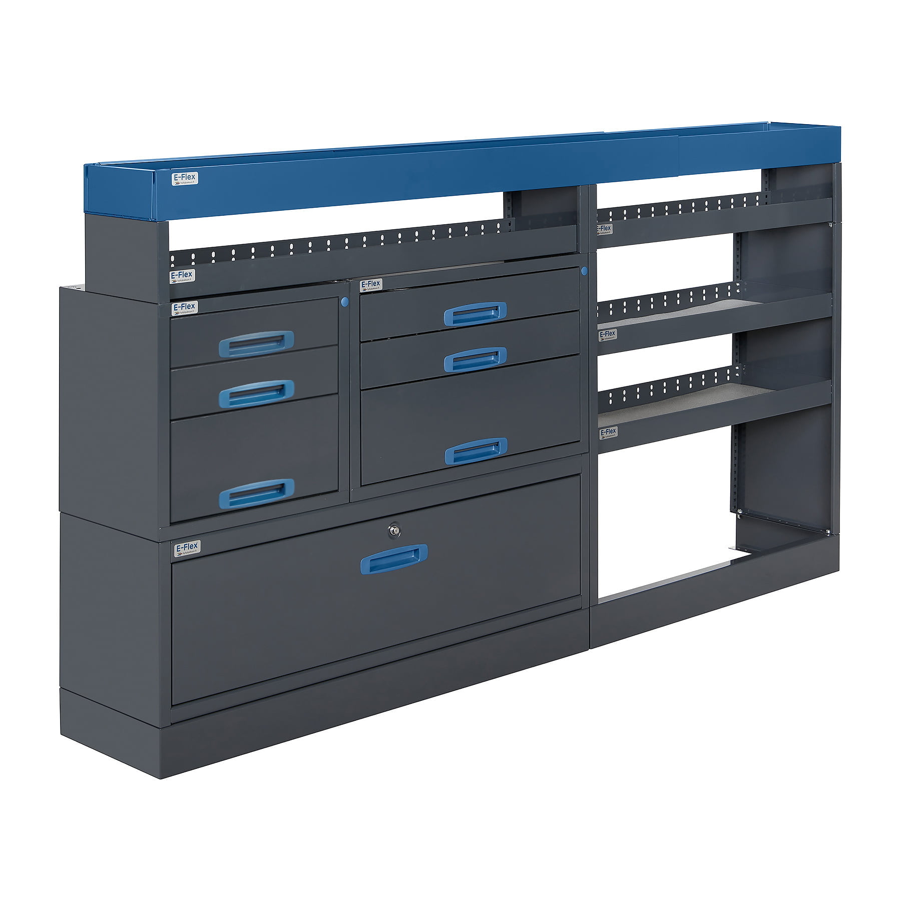 durable E-Flex van racking units / drawer units are popular and versatile van storage solutions. The furniture combines drawer units, open shelves, and other storage spaces. The primary color of the racking units / drawer units is powder-coated anthracite, with a secondary stylish powder-coated blue color. The modular design makes it easy to assemble and install. Due to the modular structure, the systems are also highly customizable. The drawer rails are ball-bearing equipped (load capacity 40 kg) and designed specifically for vans, meaning the drawers lock in place both when open and closed, preventing them from opening during driving. We provide a 10-year warranty, ensuring these products withstand demanding professional use. Complete your setup with the necessary