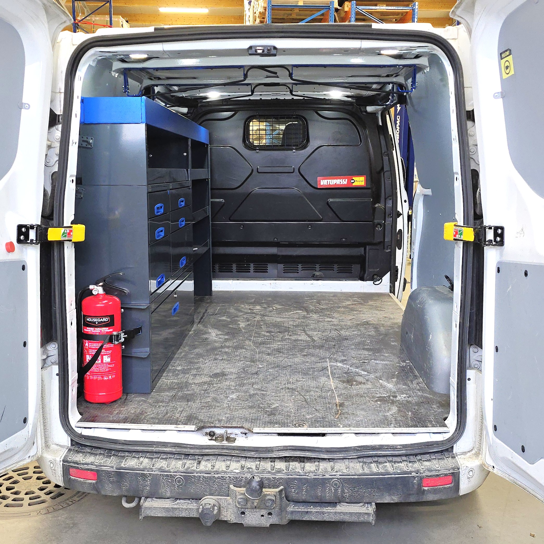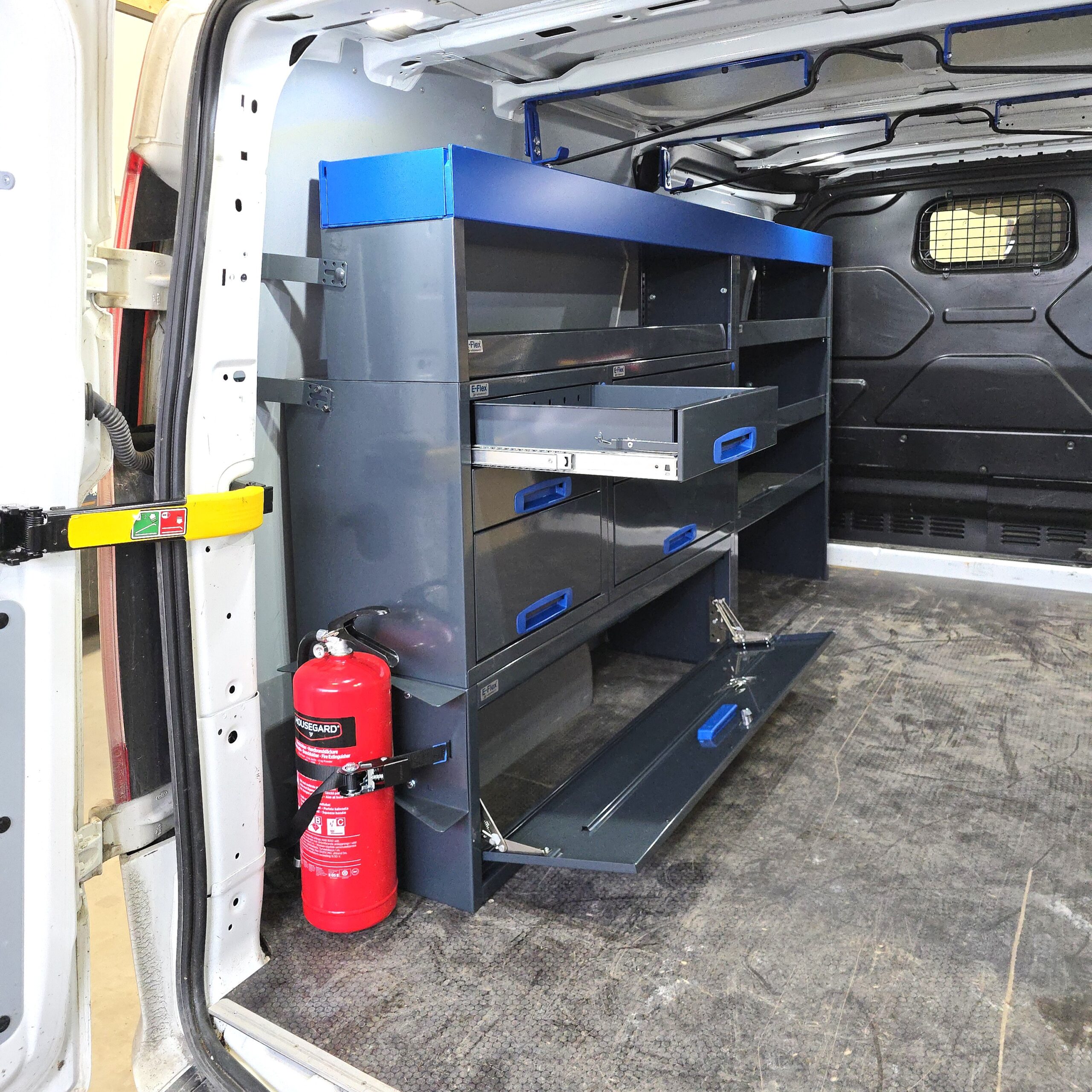 This racking system is designed for L2H1-size vans and is particularly suitable for models such as Ford Transit Custom L2 Long, M-B Vito Long, Nissan Primastar Long, Renault Trafic Long, VW Transporter Long. The system combines drawer units, open shelves, and storage spaces, offering a versatile and customizable storage solution for professional use. The powder-coated anthracite and blue colors make it a stylish and durable choice. The ball-bearing drawer rails (load capacity 40 kg) are specifically designed for vans, meaning the drawers lock in both open and closed positions, preventing them from opening during driving. A 10-year warranty is provided for the product, ensuring its durability in demanding conditions. Complete your storage setup with the necessary accessories.TÜV Tested Van Racking System