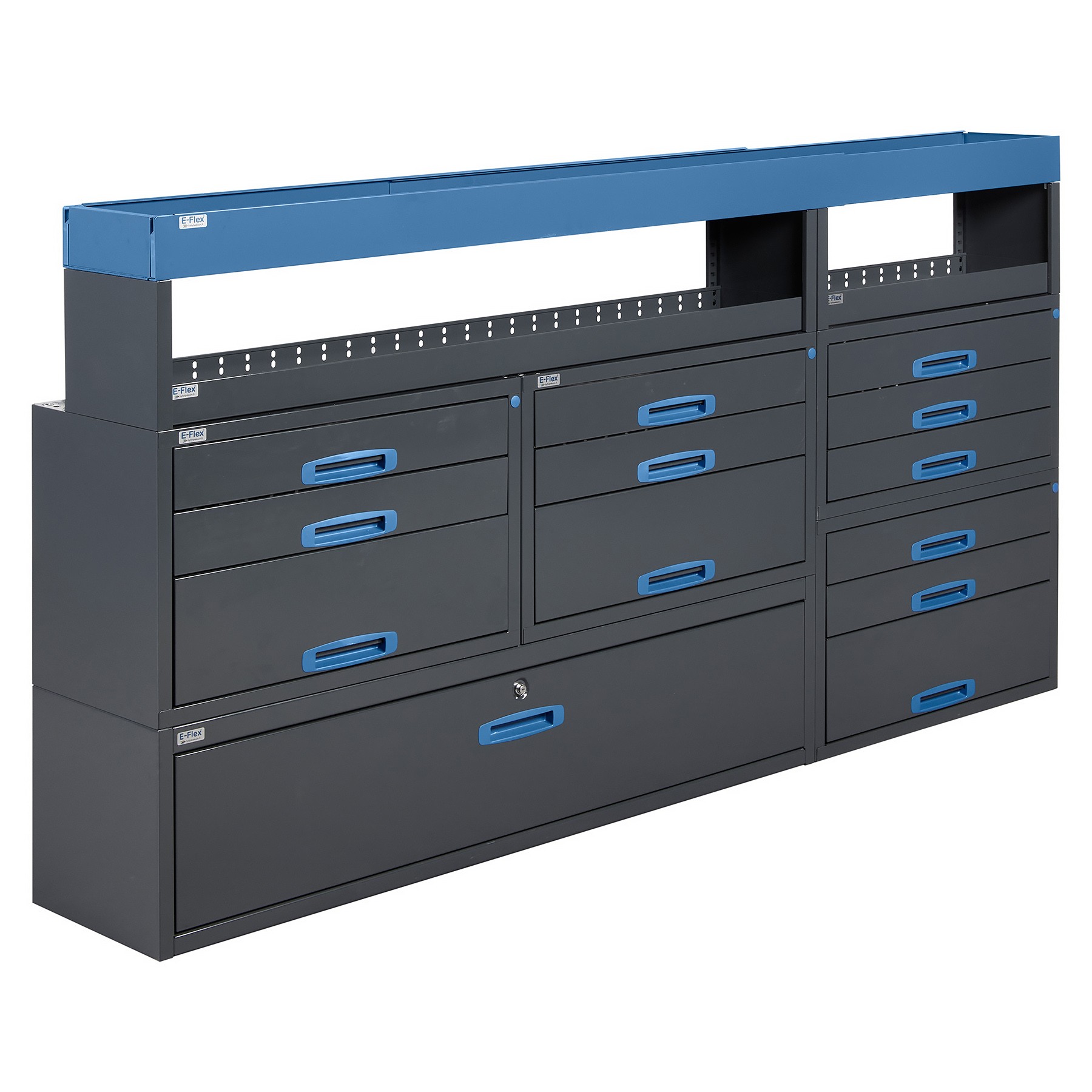 The core of this system is the large number of wide drawer modules, providing exceptional storage capacity for connectors, fittings, fasteners and hand tools.