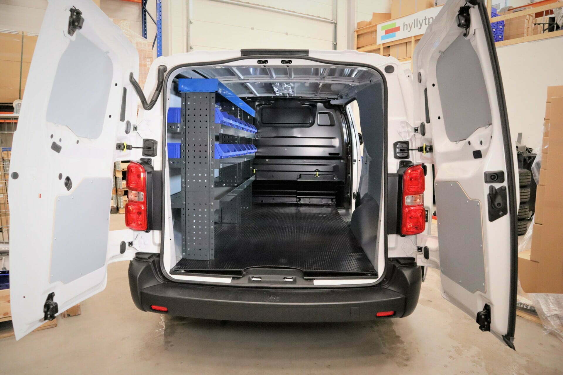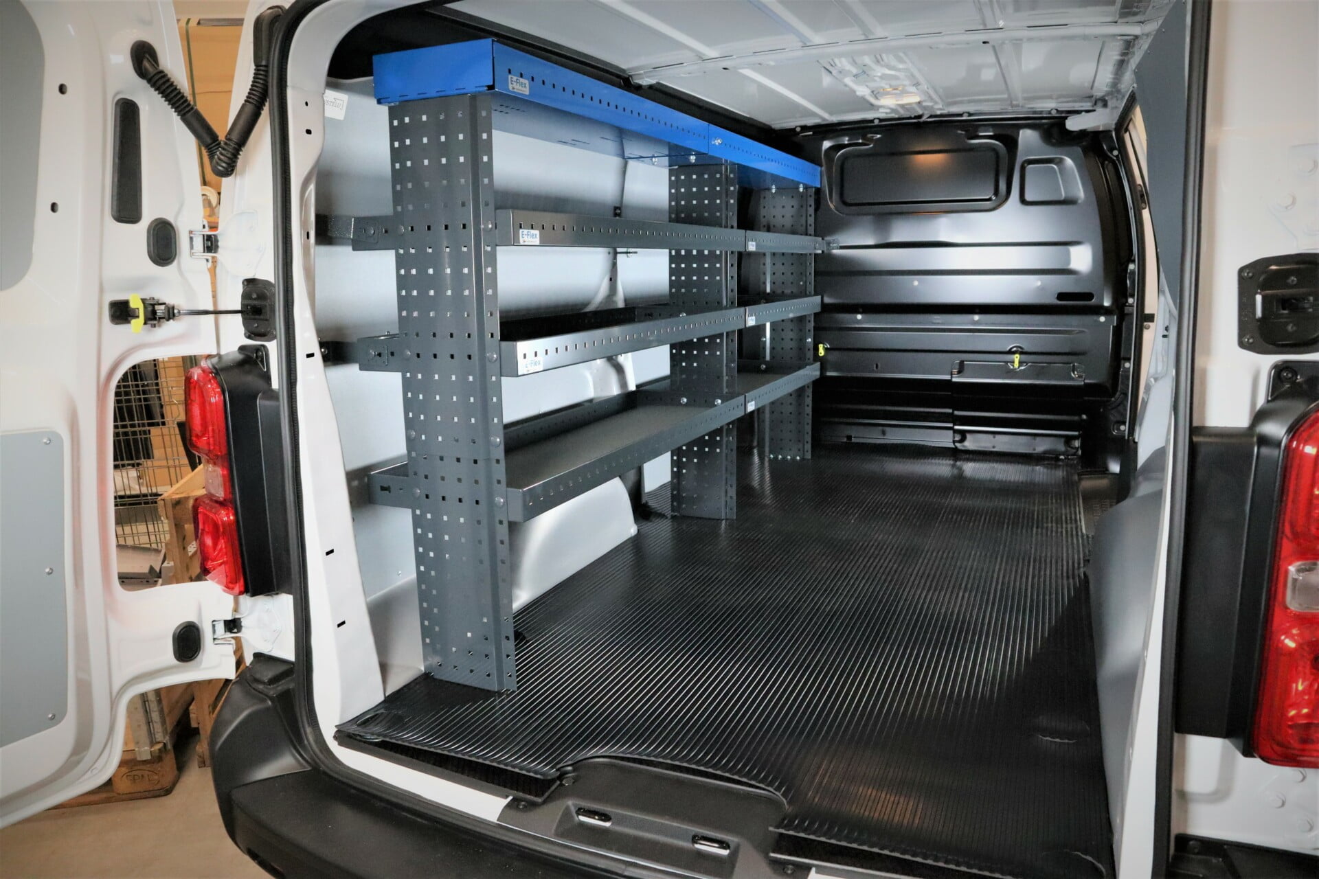 E-Flex 230 cm van shelf with four height-adjustable shelf levels. The open shelf keeps the van organised in a stylish and easy way.