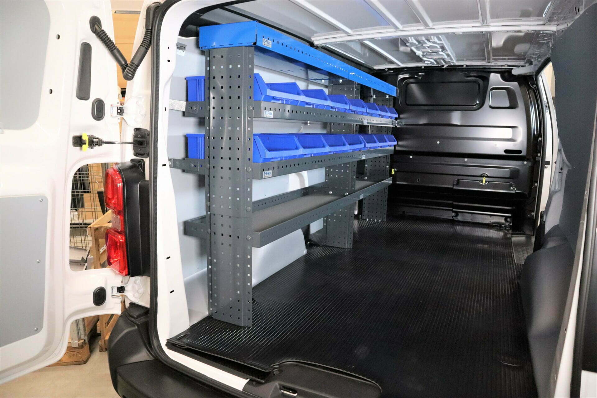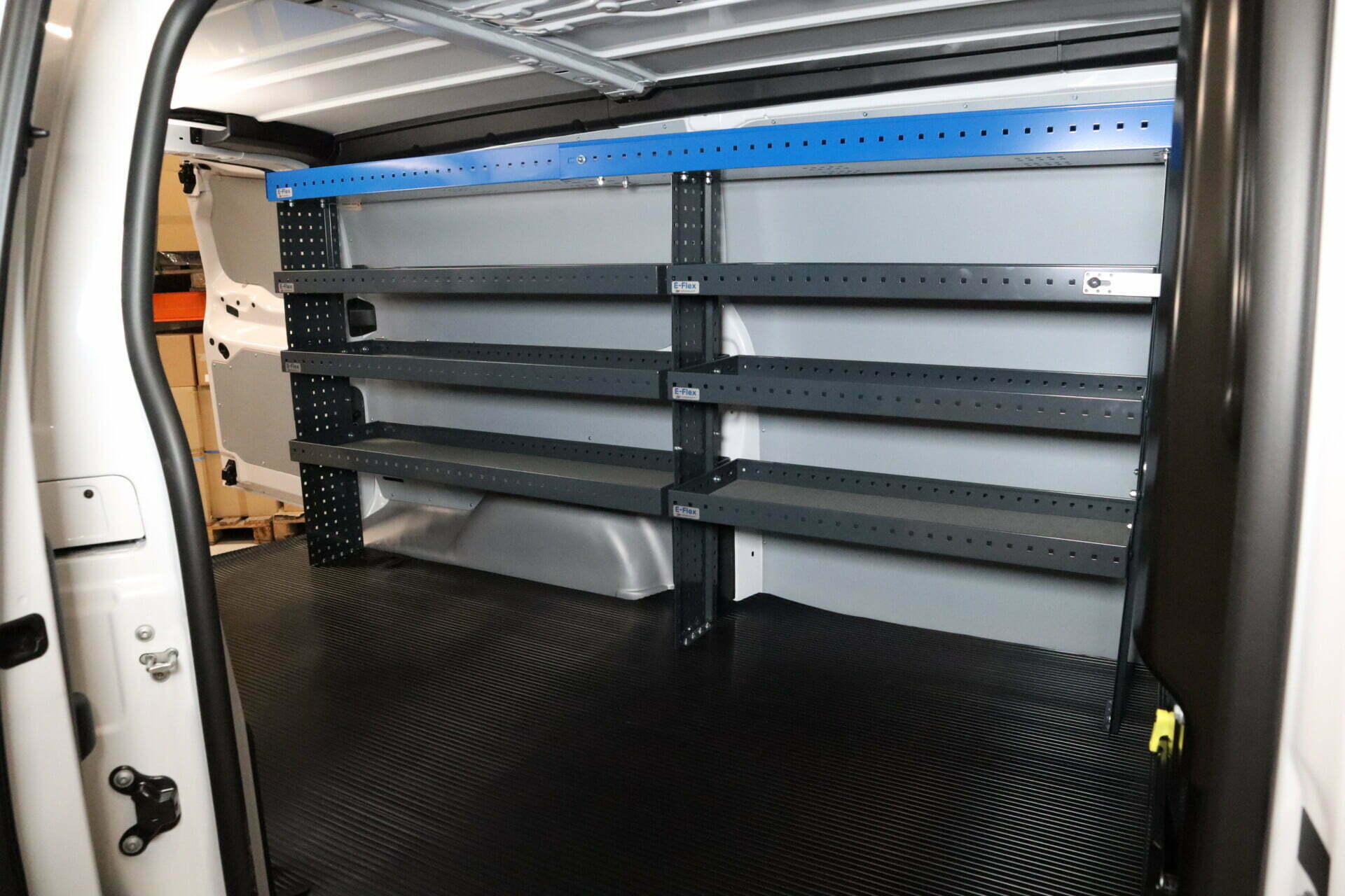 The structure of the shelf levels and end panels allows them to be installed at different depths to accommodate the curved interior wall of the van. The standard GWS hole pattern enables the shelving system to be complemented with various accessories, such as boxes. Complete your shelving system with E-Flex boxes and other accessories.