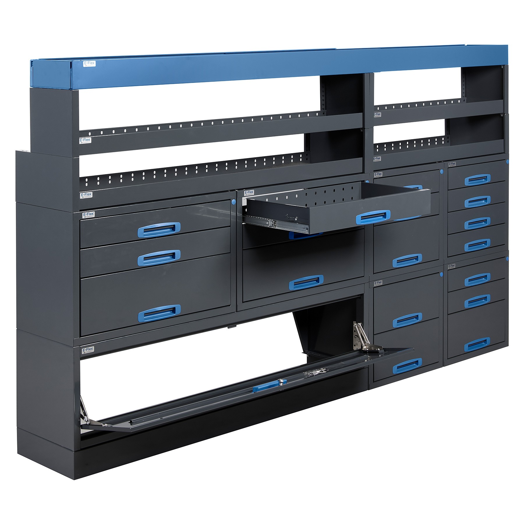 The durable E-Flex van racking systems are popular and versatile storage solutions for professional vans. The system combines drawer modules, open shelves and enclosed storage to create a highly functional storage layout.