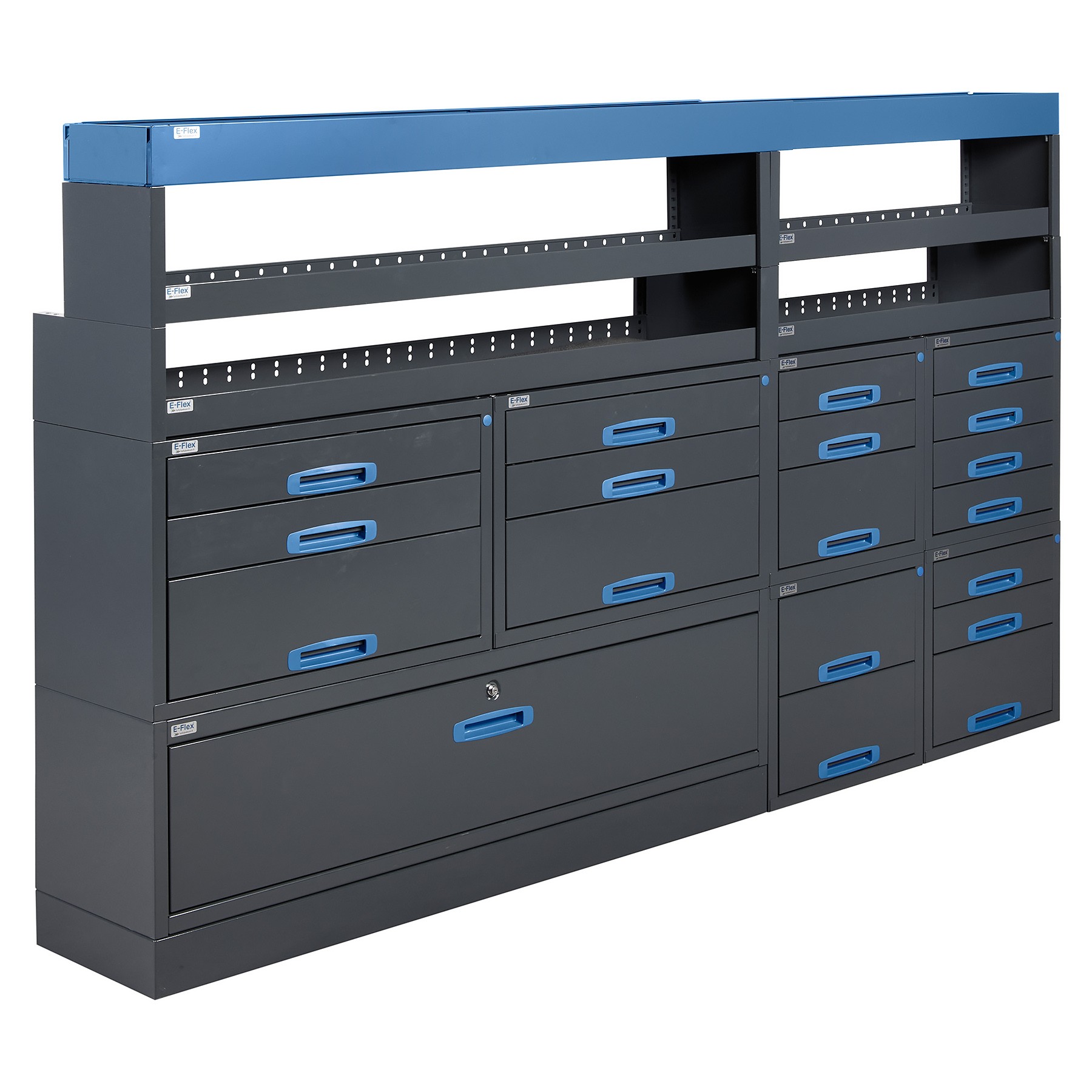 The 254 cm van racking unit with extra drawers height 154 cm is a large and highly versatile storage system designed for professional service and installation vans. The system combines multiple drawer modules, open shelving and additional storage compartments, providing a well organized workspace for tools, parts and equipment.