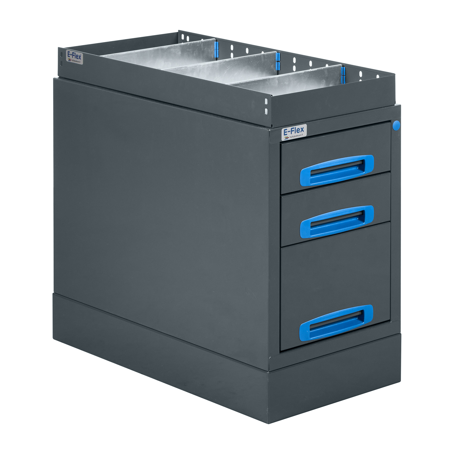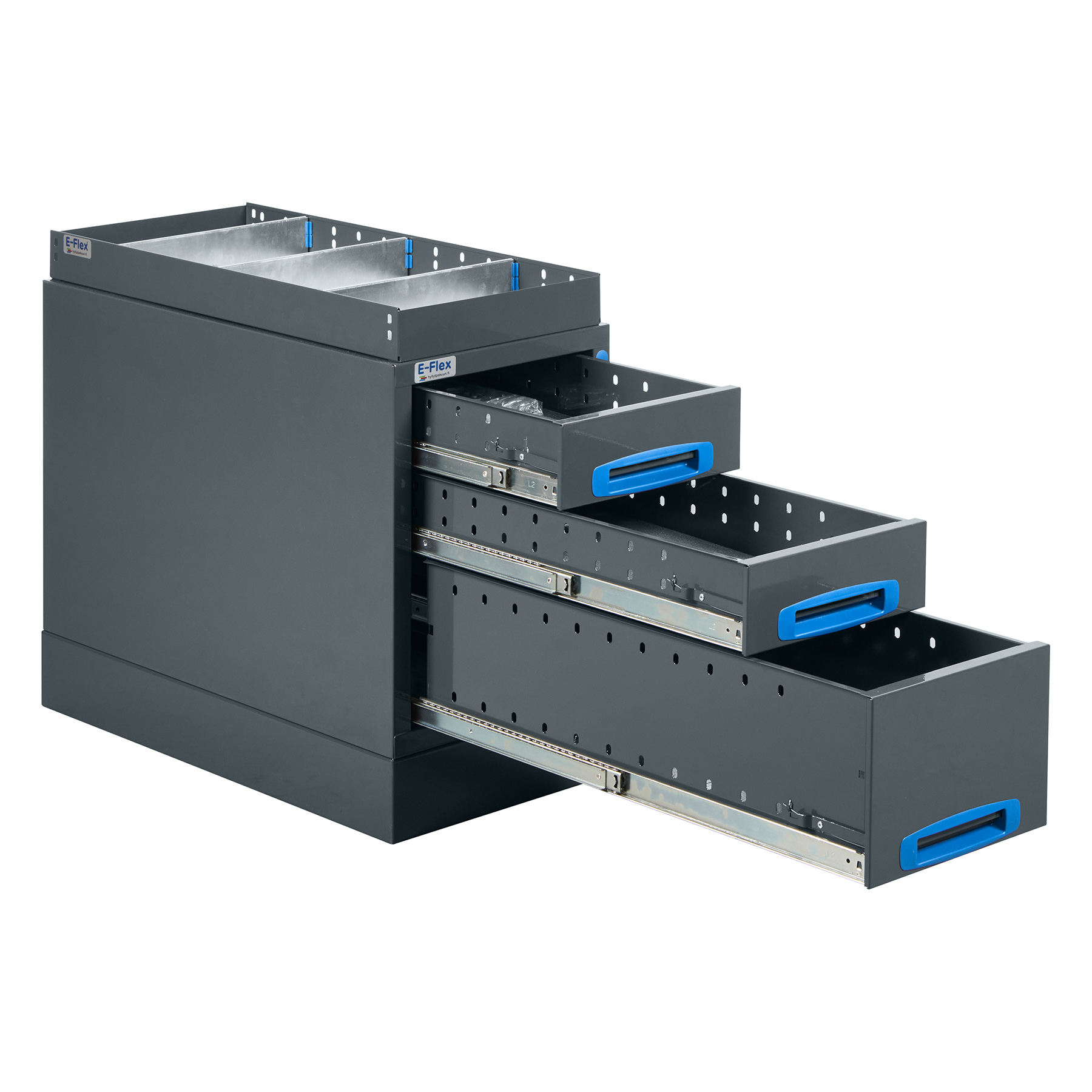 The drawer unit features one 20 cm high drawer and two 10 cm high drawers, all equipped with anti-slip mats and dividers. The ball-bearing slide rails ensure smooth operation, while the latching mechanism keeps the drawers securely closed during transport. The internal drawer width is 25.5 cm, and the open shelf surface on top of the module offers additional storage space. The Product dimensions and contents: an assembly kit and a mounting kit for quick and easy installation.
