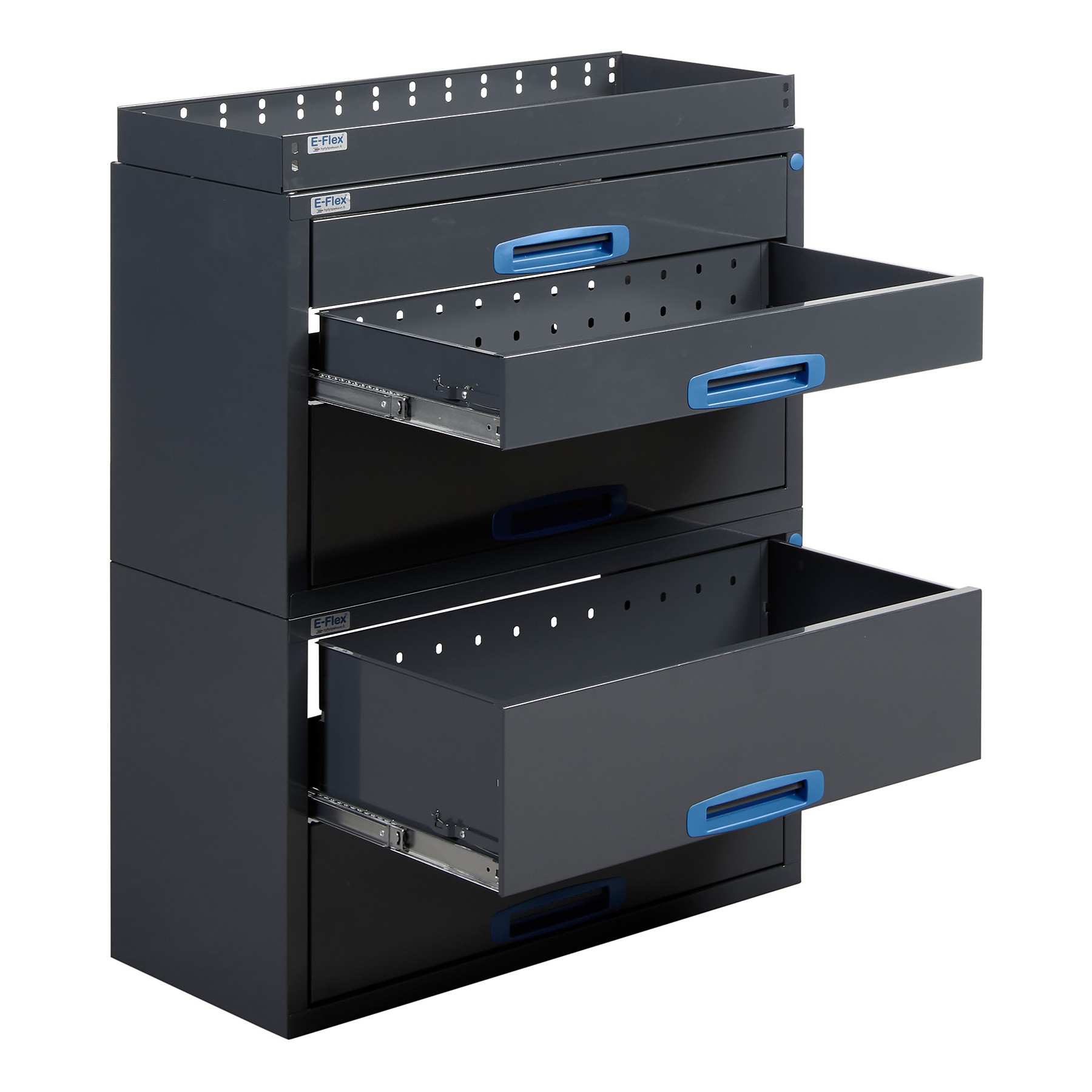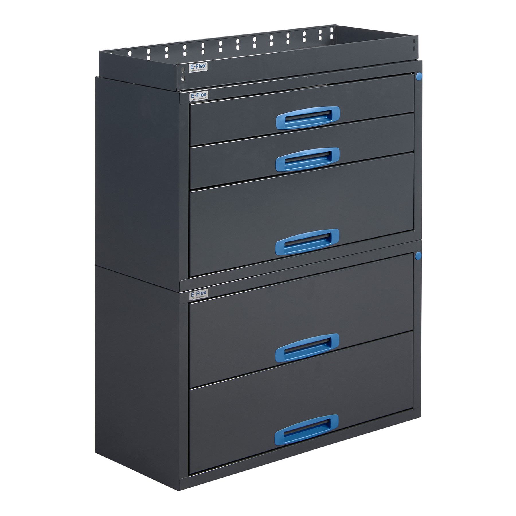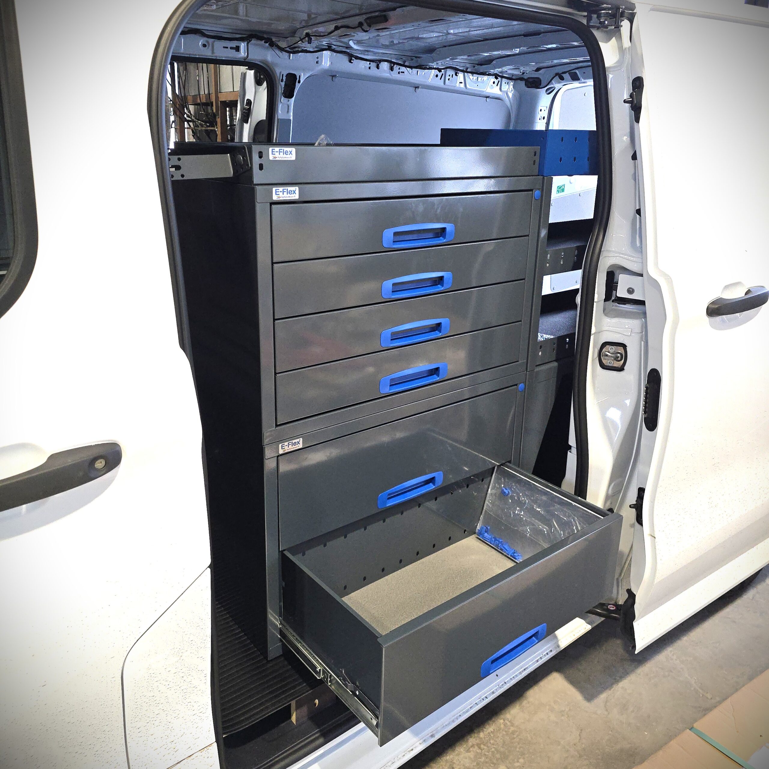 Built for tough daily use, the E Flex drawer unit features a strong steel structure with a powder coated anthracite finish and stylish blue accents. The modular design allows the system to be expanded with shelves, service cases or gas cylinder holders depending on your trade and workflow.
