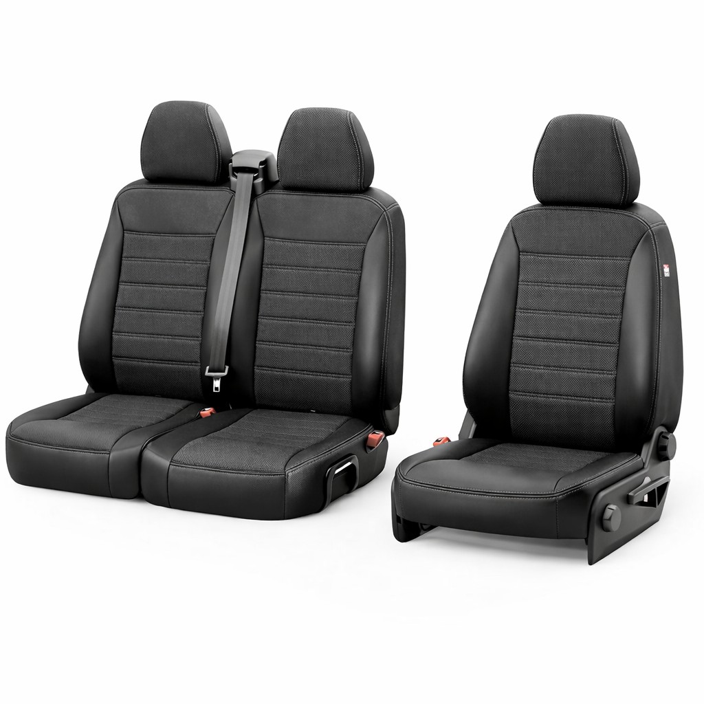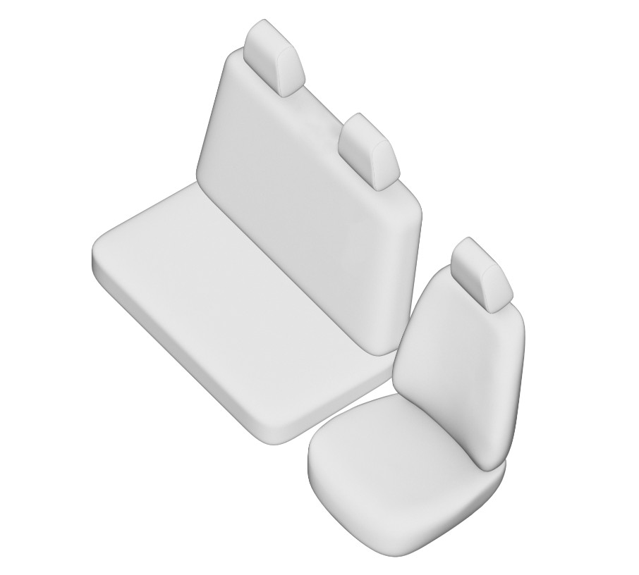Premium seat covers designed for Volkswagen ID.Buzz vans with a 1+2 front seat configuration. The durable semi synthetic leather construction is designed to withstand work use, long drives and active everyday life. The material is easy to clean and effectively protects the original upholstery from wear, dirt and liquids.