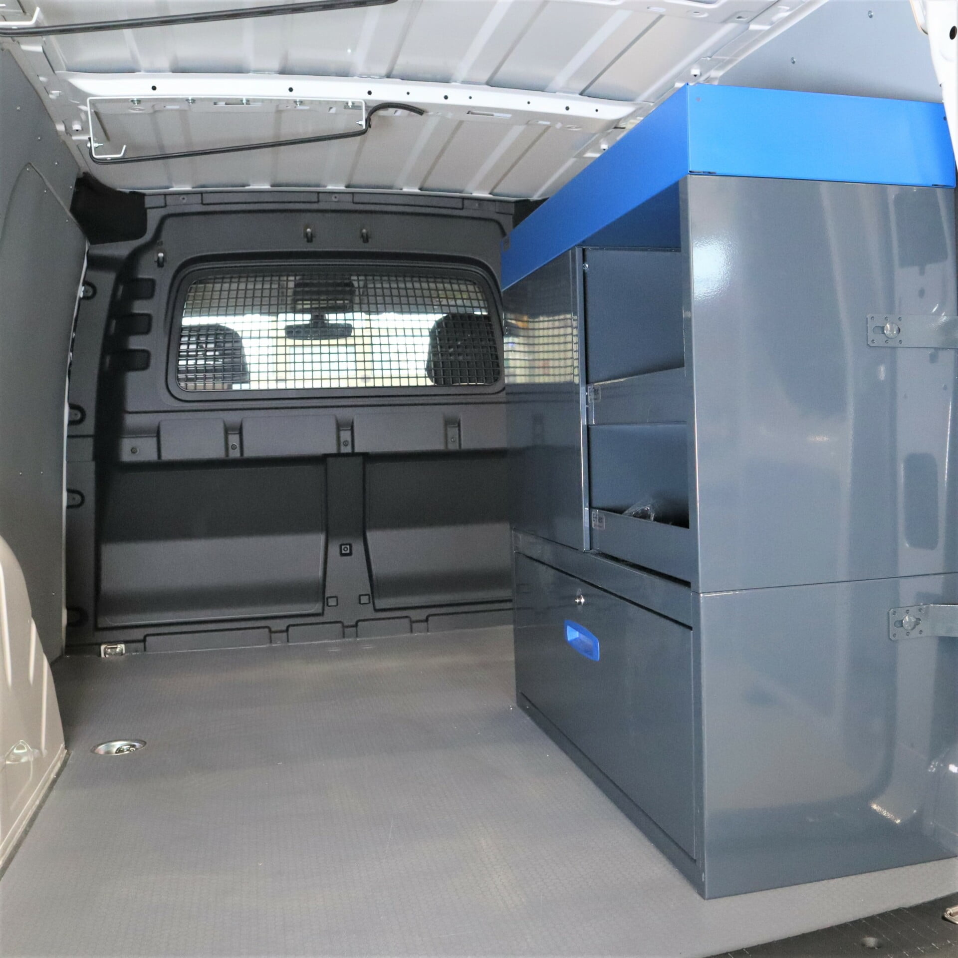 Robusta E-Flex förvaringssystem för skåpbilar är populära och mångsidiga inredningslösningar. Kombinationen av utdragslådor, öppna hyllor och andra förvaringsutrymmen gör systemet praktiskt och effektivt. Hyllsystemen är pulverlackerade i antracit med stilrena blå detaljer. Modulsystemet gör det enkelt och smidigt att montera och installera, samtidigt som det erbjuder flexibilitet för anpassning. Lådorna har kullagrade skenor med en lastkapacitet på 40 kg och är konstruerade specifikt för skåpbilar – de låses på plats både i öppet och stängt läge, vilket förhindrar att de öppnas under körning.