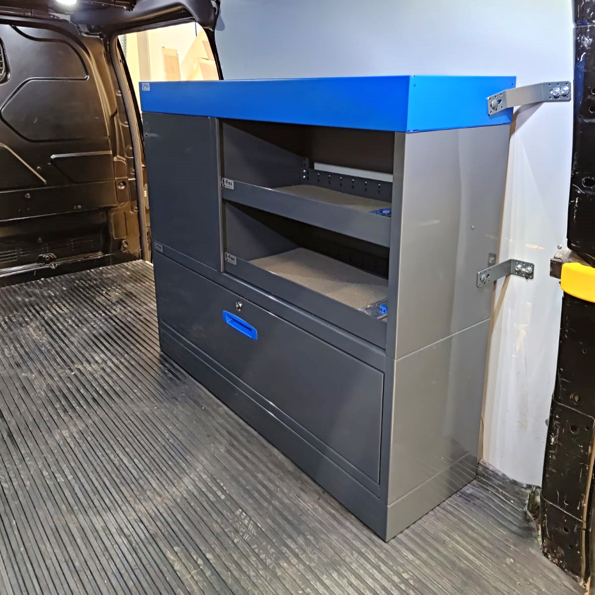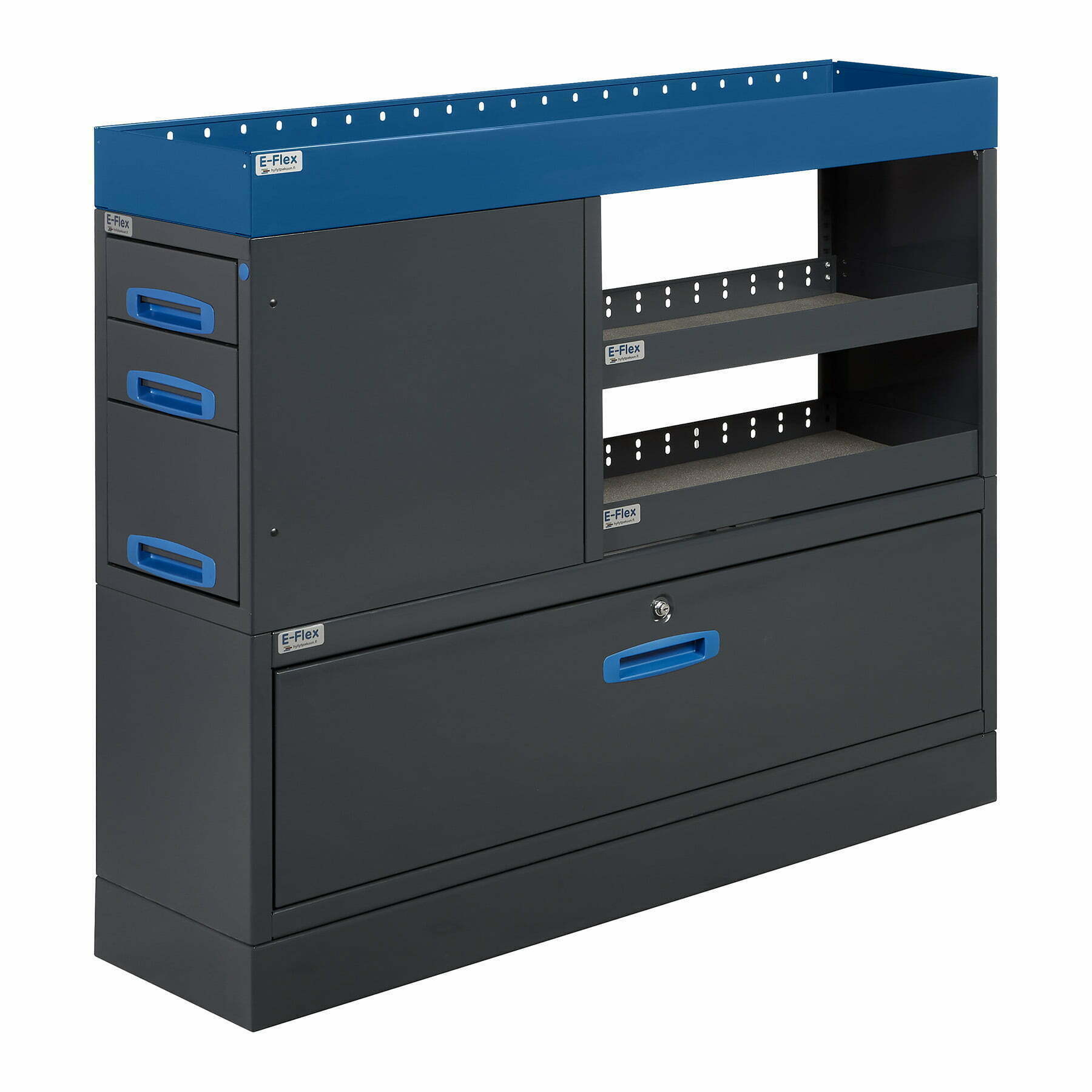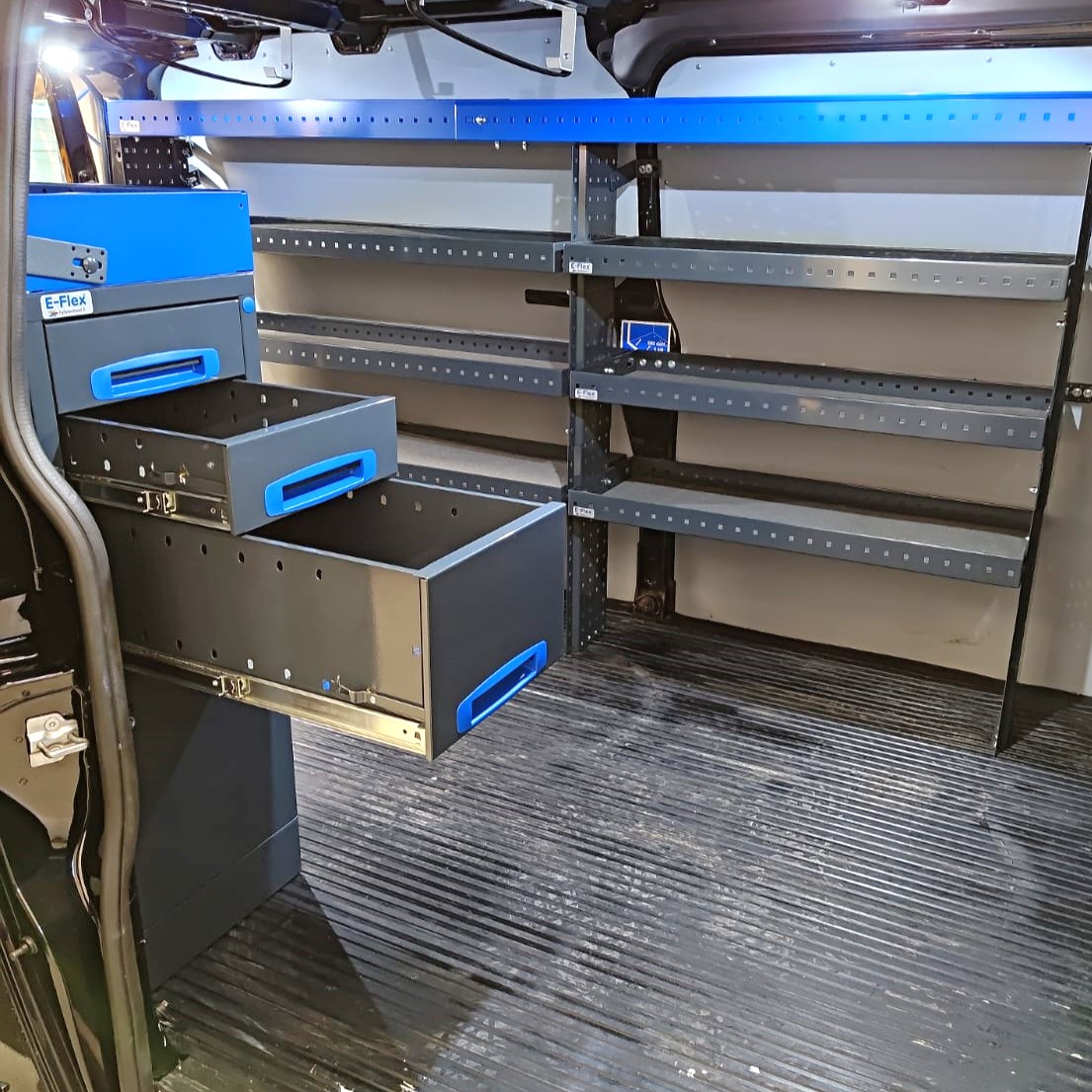 Robusta E-Flex förvaringssystem för skåpbilar är populära och mångsidiga inredningslösningar. Kombinationen av utdragslådor, öppna hyllor och andra förvaringsutrymmen gör systemet praktiskt och effektivt. Hyllsystemen är pulverlackerade i antracit med stilrena blå detaljer. Modulsystemet gör det enkelt och smidigt att montera och installera, samtidigt som det erbjuder flexibilitet för anpassning. Lådorna har kullagrade skenor med en lastkapacitet på 40 kg och är konstruerade specifikt för skåpbilar – de låses på plats både i öppet och stängt läge, vilket förhindrar att de öppnas under körning.