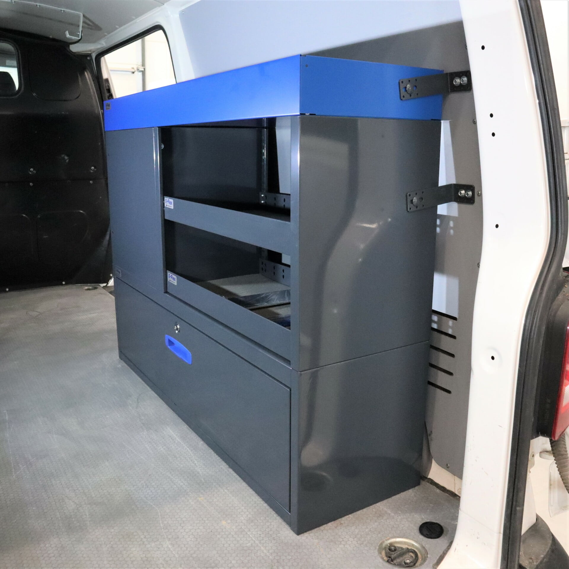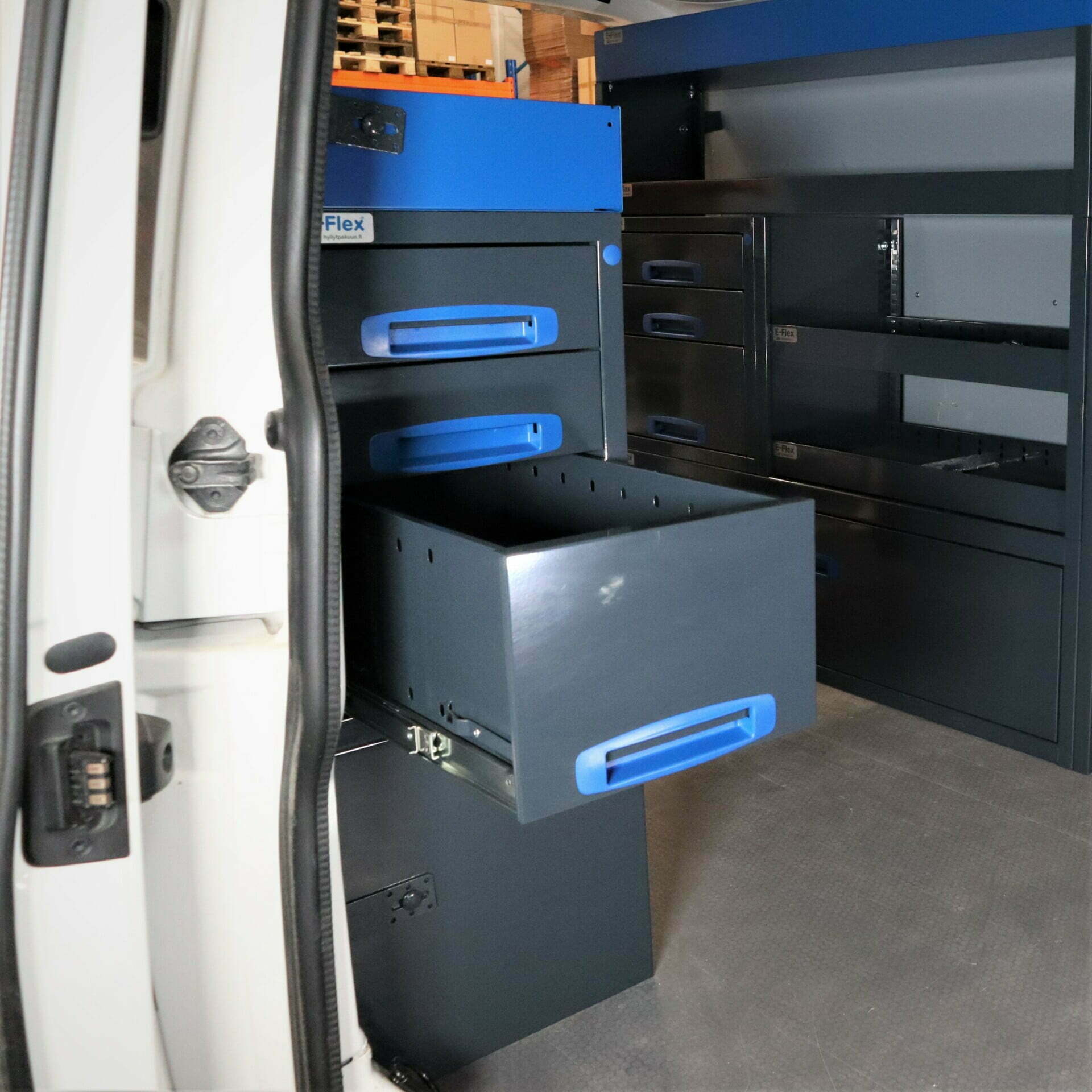 Robusta E-Flex förvaringssystem för skåpbilar är populära och mångsidiga inredningslösningar. Kombinationen av utdragslådor, öppna hyllor och andra förvaringsutrymmen gör systemet praktiskt och effektivt. Hyllsystemen är pulverlackerade i antracit med stilrena blå detaljer. Modulsystemet gör det enkelt och smidigt att montera och installera, samtidigt som det erbjuder flexibilitet för anpassning. Lådorna har kullagrade skenor med en lastkapacitet på 40 kg och är konstruerade specifikt för skåpbilar – de låses på plats både i öppet och stängt läge, vilket förhindrar att de öppnas under körning.