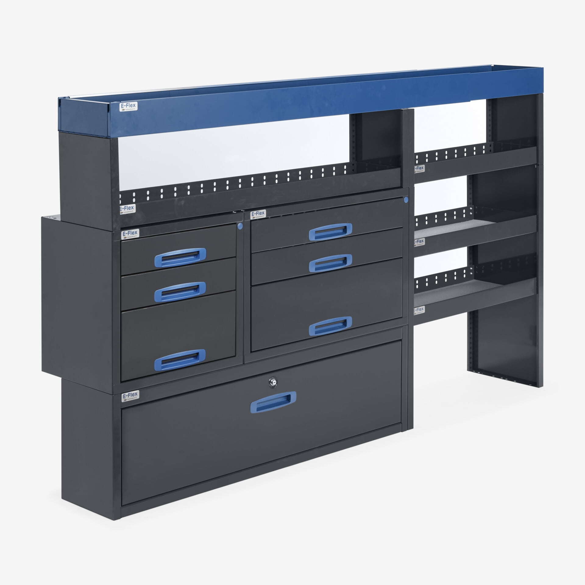 De robusta E-Flex bilinredningarna är populära och mångsidiga förvaringslösningar för skåpbilar. Inredningen kombinerar utdragbara lådor, öppna hyllor och andra förvaringsutrymmen. Huvudfärgen är pulverlackerad antracit och kompletteras av en stilren blå nyans.