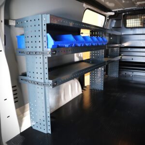 Den 230 cm bilinredning hylla höjd 91 cm är en hållbar och praktisk förvaringslösning utvecklad för professionella användare av skåpbilar som behöver pålitlig och välorganiserad förvaring för verktyg, material och utrustning. Systemet erbjuder generöst hyllutrymme samtidigt som den relativt låga höjden håller lastutrymmet öppet och lätt att arbeta i.