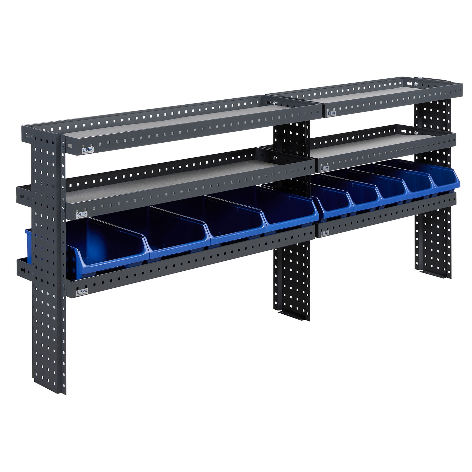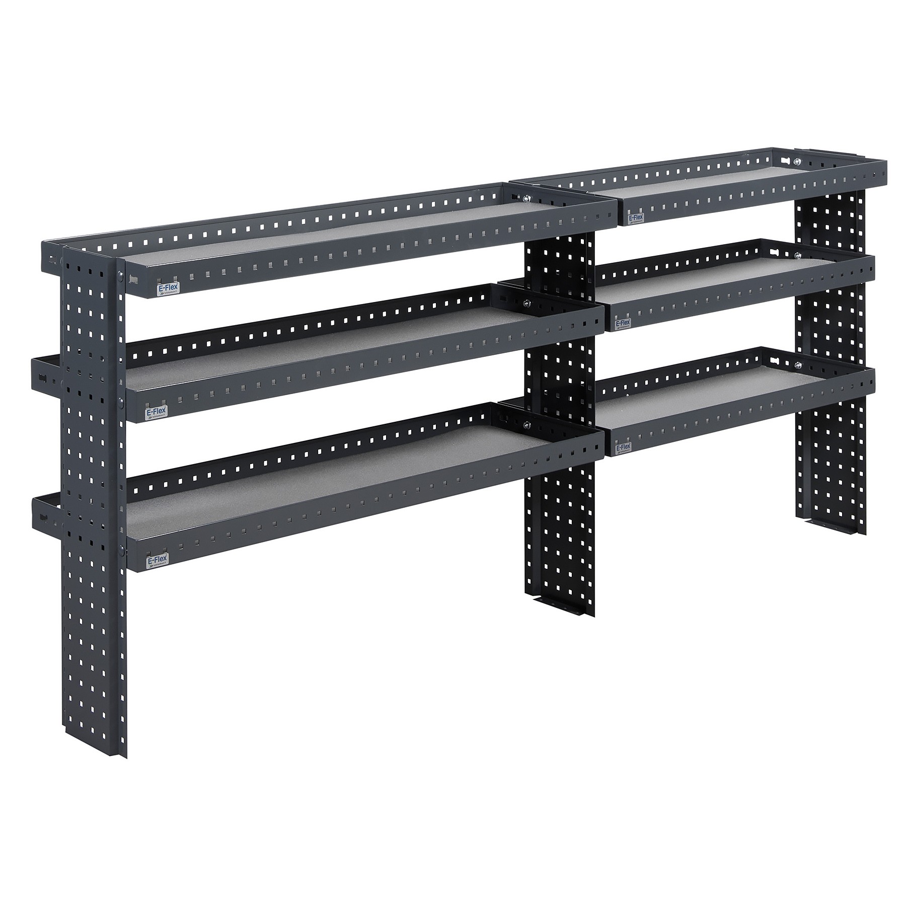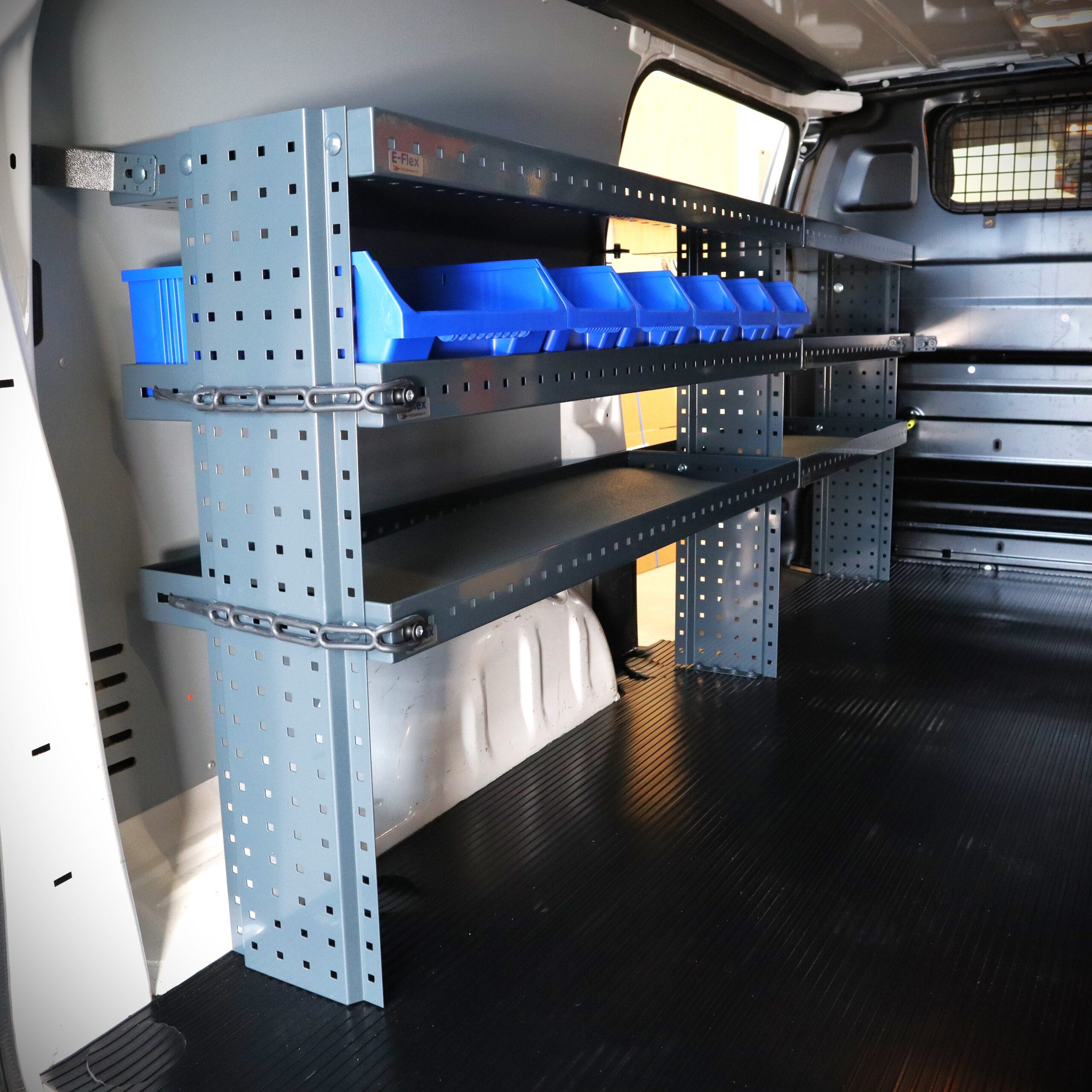 E-Flex bilinredningssystem är utvecklat för att ge en stark och långvarig förvaringslösning i professionella arbetsfordon. Hyllorna tillverkas i Finland av 1,5 mm stål med modern produktionsteknik.