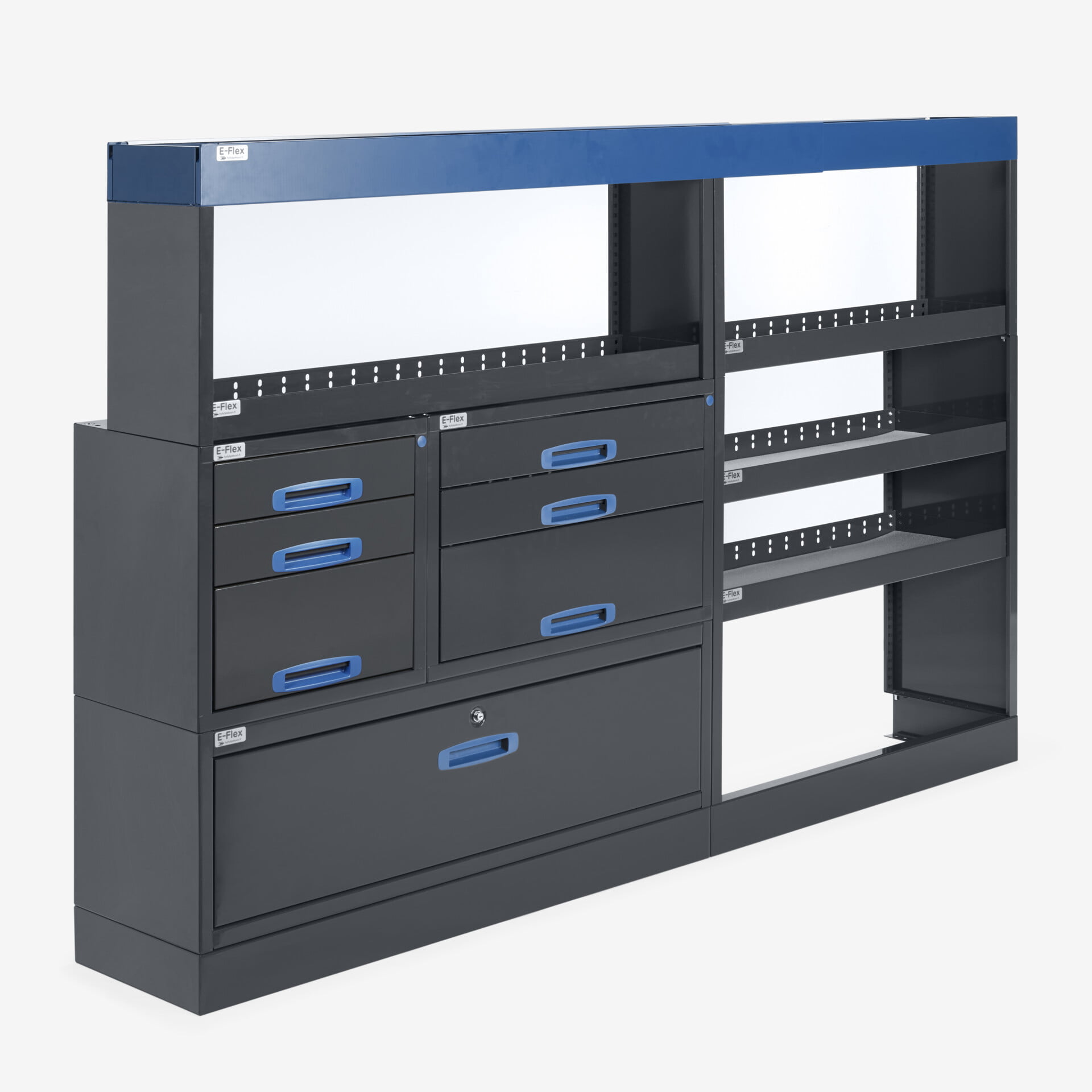 Robusta E-Flex bilinredningar är populära och mångsidiga förvaringslösningar för skåpbilar. Inredningen kombinerar utdragslådor, öppna hyllor och andra förvaringsutrymmen. Huvudfärgen är pulverlackerad antracit, kompletterad med en stilren blå pulverlackering.