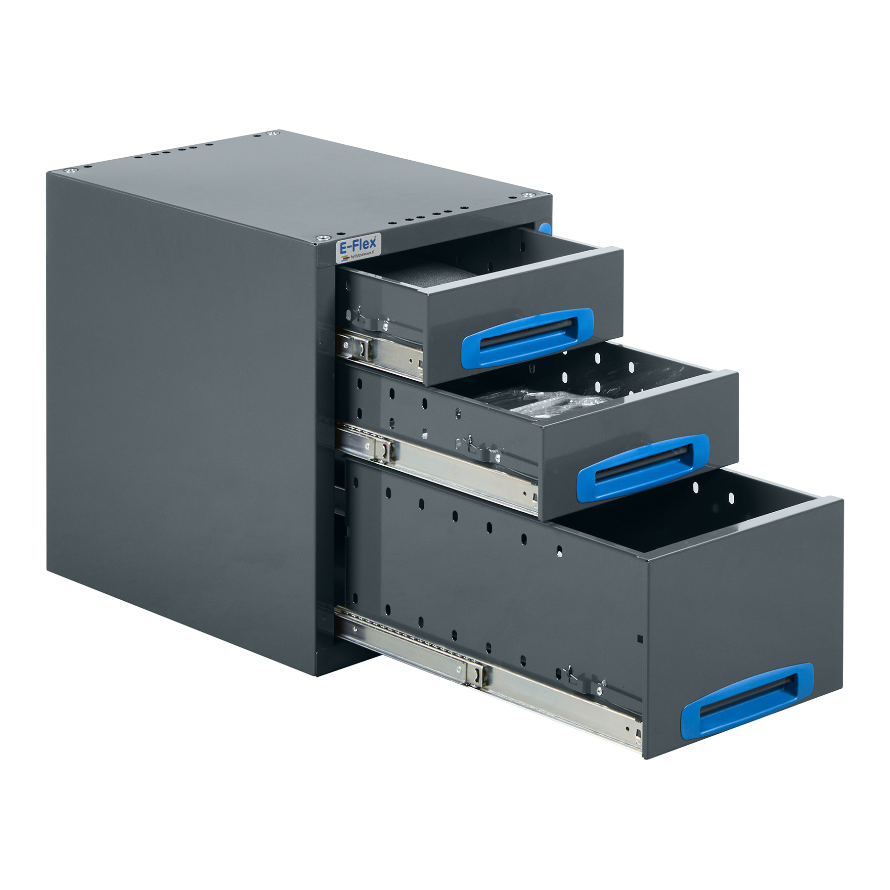 Robusta E-Flex utdragslådsystem för skåpbil är populära och mångsidiga förvaringslösningar för skåpbilar. E-Flex utdragslådsystem har pulverlackerad antracit som huvudfärg och en stilren pulverlackerad blå som sekundär färg. Produktpaketen består av moduler som är enkla och tydliga att montera och installera. Tack vare modulstrukturen är produktpaketen också mycket flexibla att anpassa. Vi ger 10 års garanti på produkterna, vilket säkerställer att de verkligen håller även vid krävande professionell användning. Komplettera din inredning med nödvändiga tillbehör.
