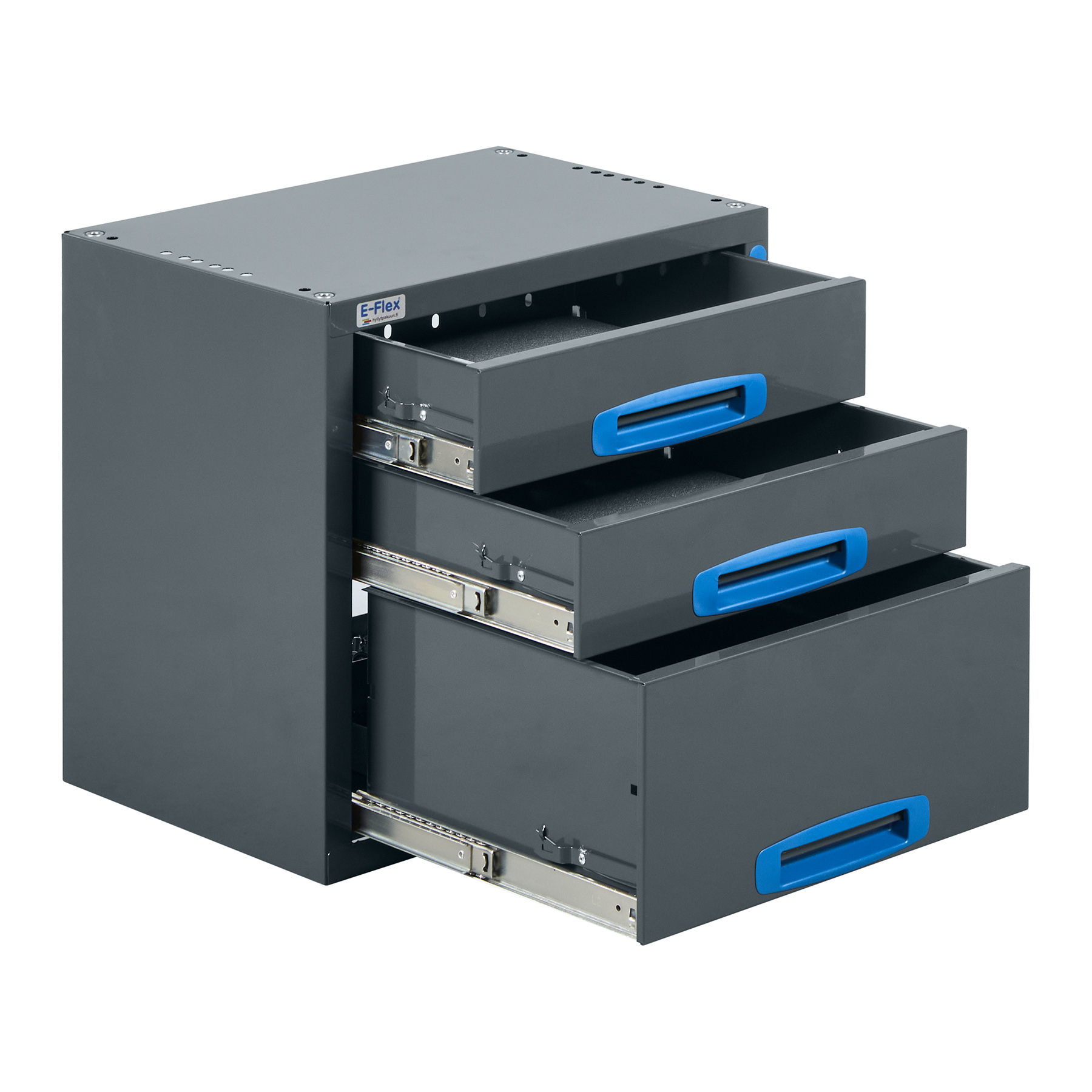Robusta E-Flex utdragslådor för skåpbil är populära och mångsidiga förvaringslösningar för skåpbilar. Huvudfärgen på E-Flex utdragslådor är pulverlackerad antracit med detaljer i elegant pulverlackerad blå. Produkthelheterna består av moduler som är enkla och tydliga att montera och installera. Moduluppbyggnaden gör det också lätt att anpassa produkterna efter behov. Vi ger 10 års garanti, vilket säkerställer att produkterna verkligen håller även vid krävande yrkesbruk. Komplettera din inredning med nödvändiga tillbehör.