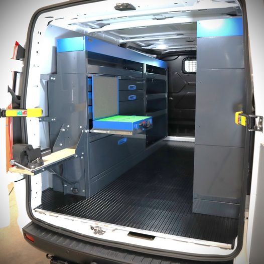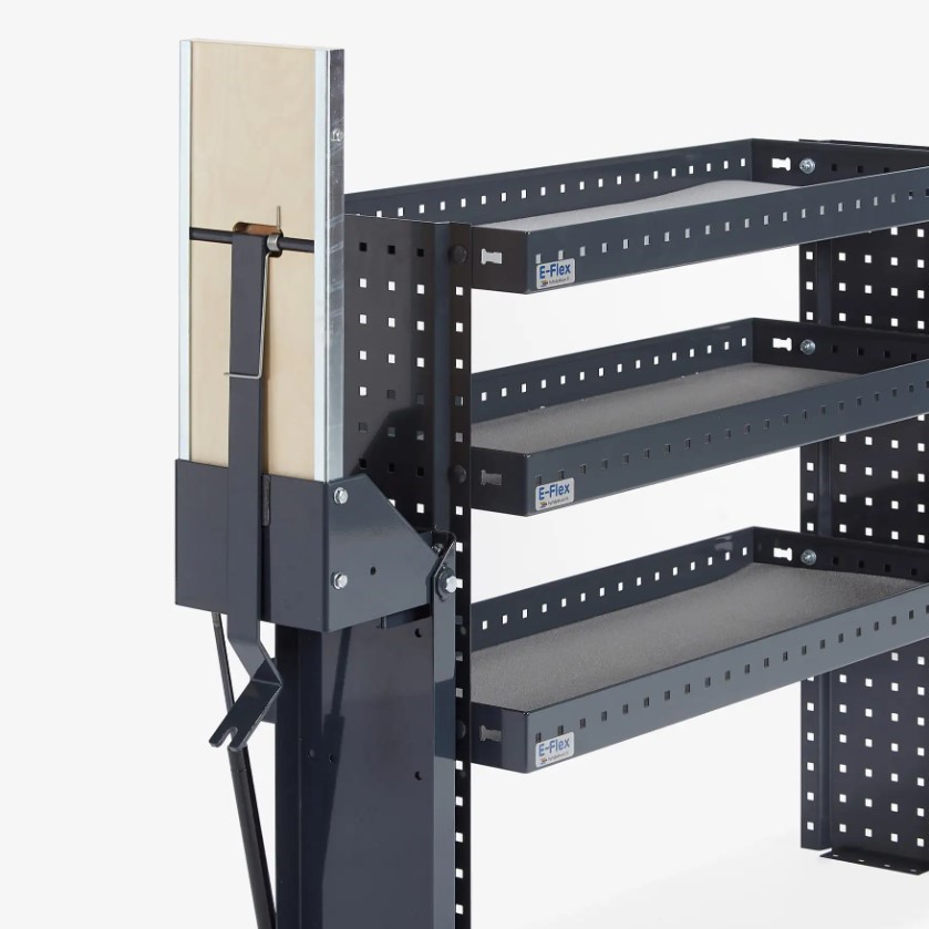 Stabil skruvstycksbänk som monteras med bultar i hyllans gavel. Om hyllan är monterad tillräckligt långt bak i fordonet kan den fällbara skruvstycksbänken svängas utanför bilen, vilket gör det möjligt att arbeta utanför lastutrymmet. Detta förhindrar att gnistor från exempelvis en vinkelslip riktas mot skåpbilens interiör. Den utåtgående skruvstycksbänken möjliggör även bearbetning av långa föremål utan att lastutrymmets storlek blir en begränsning.