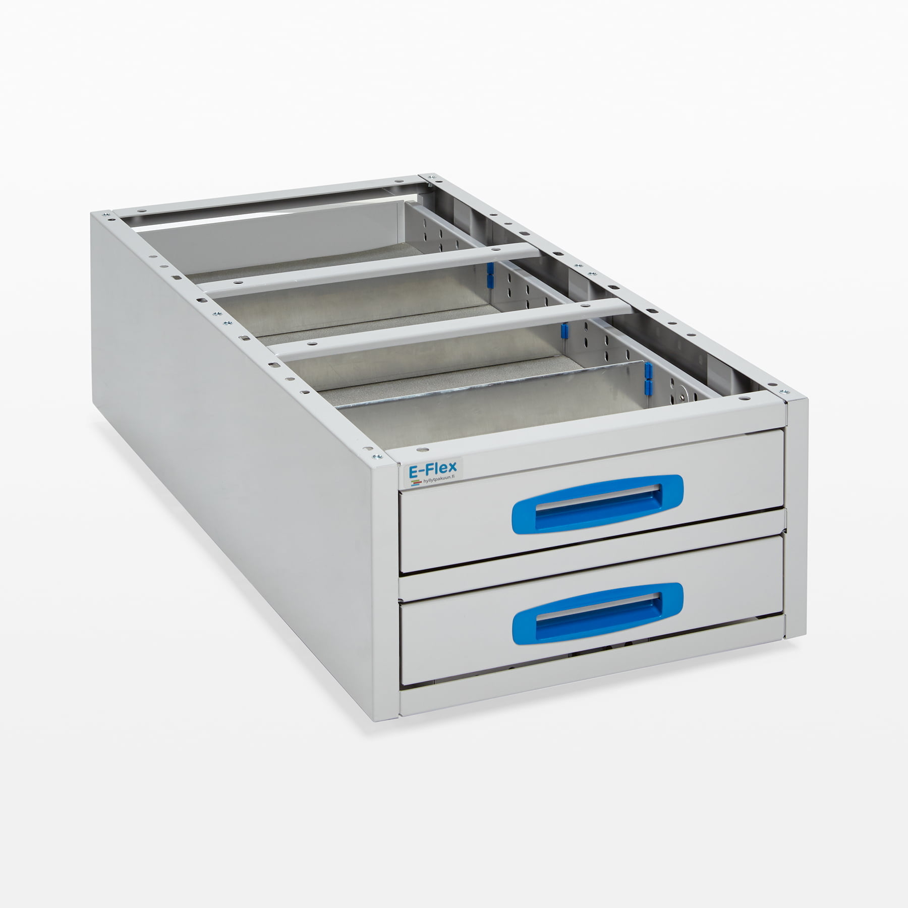 E-Flex verktygshyllor för skåpbilar är tillverkade med modern teknik för att kunna användas i många olika yrkesuppgifter. Våra hyllor är tillverkade av högkvalitativ plåt tillverkad av hållbart stål och är pulverlackerade för att tåla tung användning. Vi har redan mer än 7000 nöjda användare i Finland som litar på kvaliteten på våra produkter.